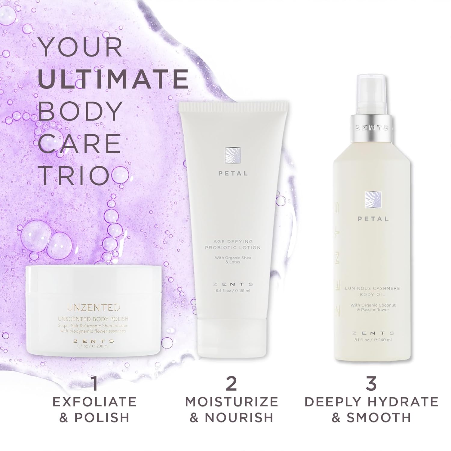 Zents Luminous Cashmere Body Oil (Petal Fragrance) | Moisturizing Body Oil with Vitamin E & Organic Coconut Oil | Softens & Smooths Skin | 8 fl oz