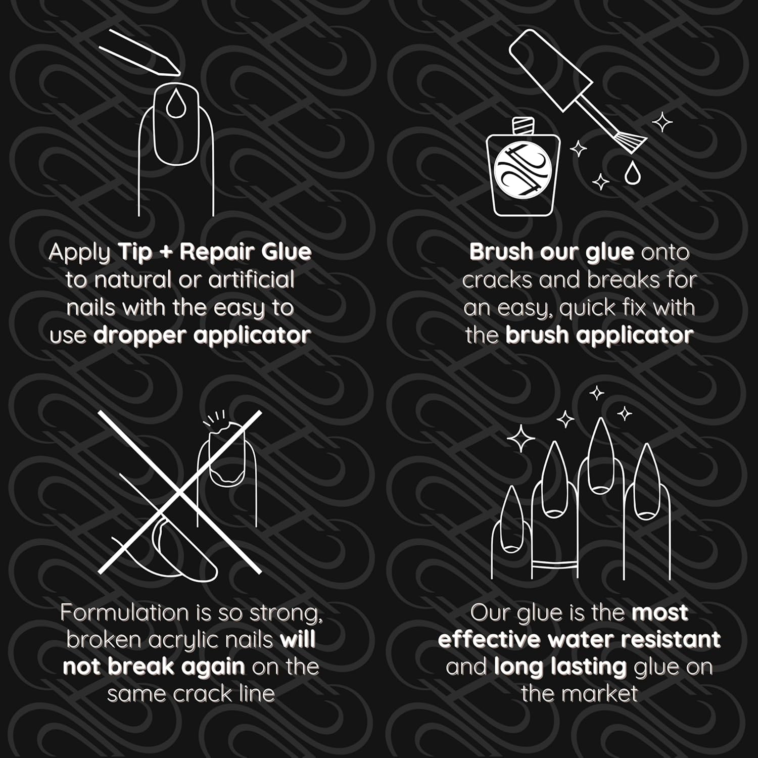 - The strongest waterproof acrylic nail glue for press ons brings beauty back to your medium, long or short coffin nail tips. Fix any fingernail, toe nail, or split nail of any kind with our nail hlue.