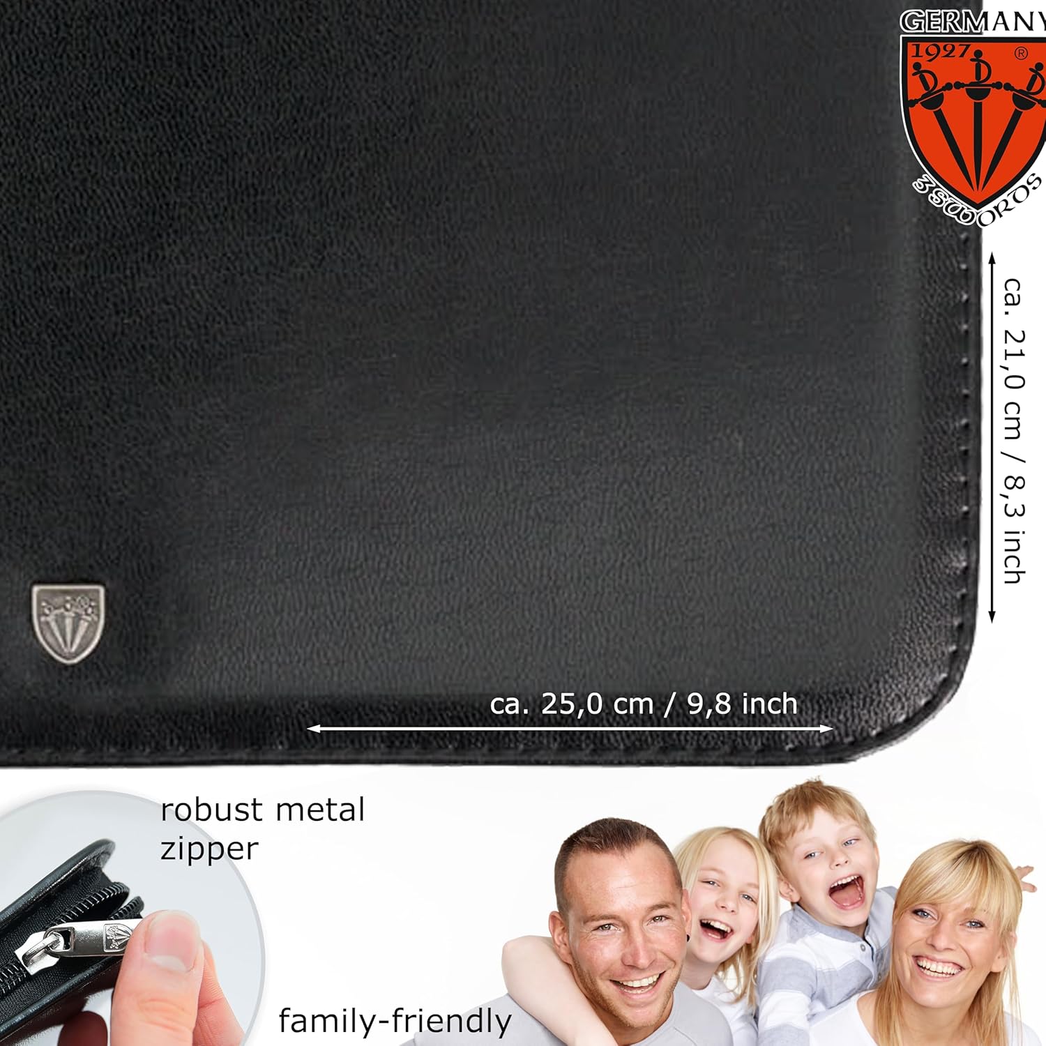 - CASE: Fashion leather black, size ca. 25,5 x 21,0 x 3,0 cm. Our organizers are made of high-grade fashion or classic materials. Additional equipment: Microfiber cleaning cloth for cleaning steel items, general info sheet “Finger - Nail Grooming”.