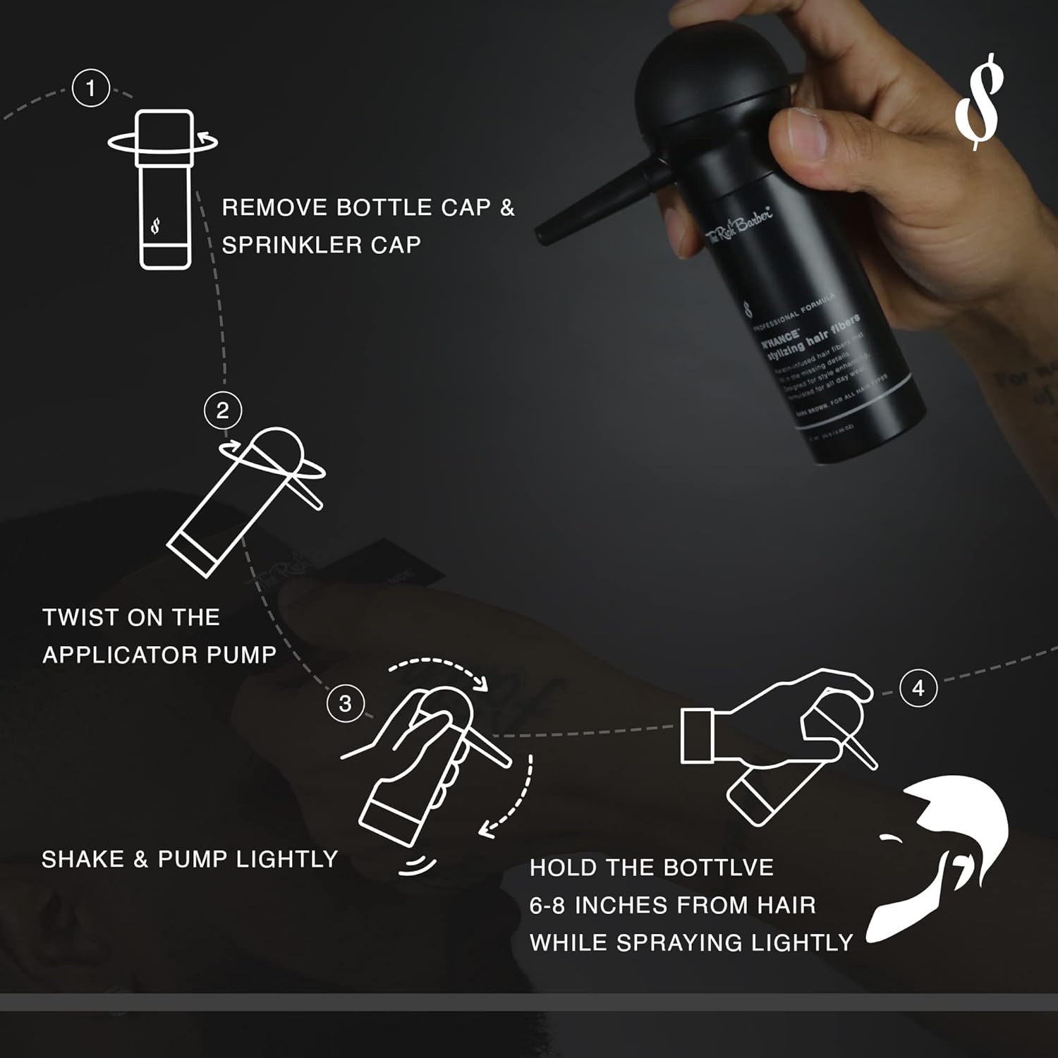 - Sharp, Well-Defined Hairlines - Create straight and full hairlines like a pro with our styling kit. It comes with a bottle of texturizing hair fiber spray for filling in hairlines and hiding patches, an Applicator Pump for even distribution of hair fibers and an Application Card for absolute precision around the hairline