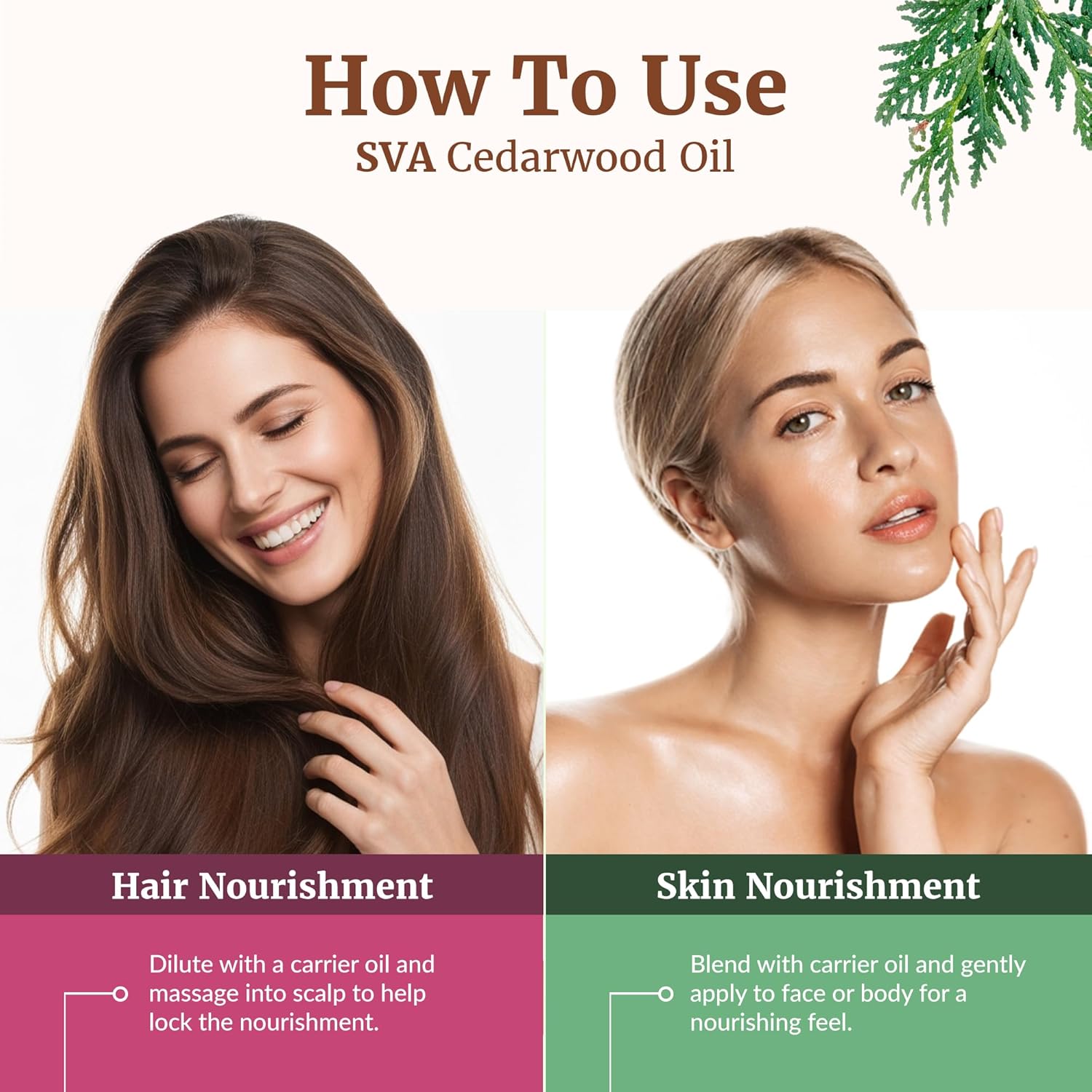 - Hair Care: SVA Cedarwood Oil is widely used for hair and scalp massage. Always dilute with suitable carrier oil before use since it is highly concentrated. For your hair care routine, simply mix a few drops of Cedarwood oil for your hair with your shampoo, conditioner, and mask and use it regularly. You can use it a few times weekly for a scalp massage after proper dilution with carrier oil