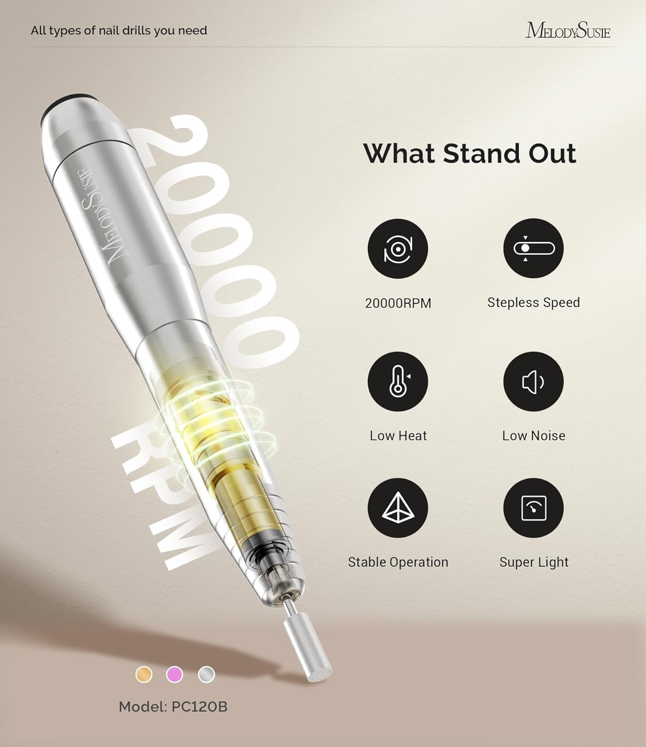 MelodySusie Portable Electric Nail Drill,PC120B Compact Efile Electrical Professional Nail File Kit for Acrylic, Gel Nails, Manicure Pedicure Polishing Shape Tools Design for Home Salon Use, Silver