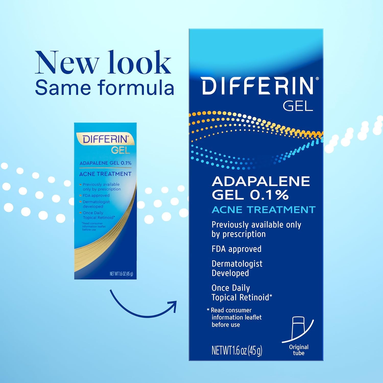 Differin Acne Treatment Gel, 180 Day Supply, Retinoid Treatment for Face with 0.1% Adapalene, Gentle Skin Care for Acne Prone Sensitive Skin, 45g Tube, Pack of 2 (Packaging May Vary)
