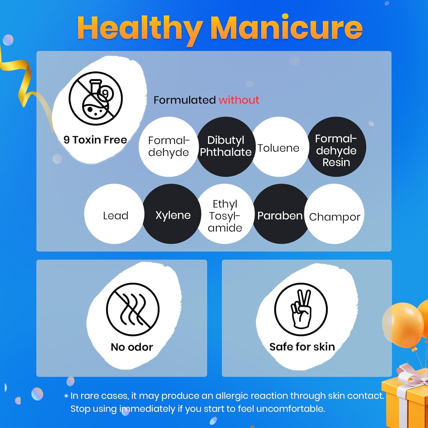 - Speed Curing with LED Nail Lamp: The gel nail polish kit needs to be cured under an LED light. Base and Top coat are required. For thick, highly pigmented gels (e.g., black and white), cure 90-120s with a 24W Nail lamp to ensure proper drying.
