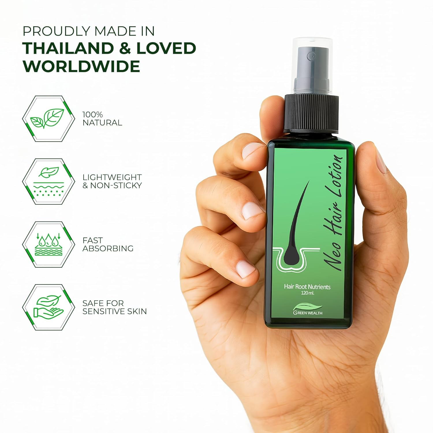 - Green Wealth Neo Hair Lotion is made from extracts from herbs to touch the main ingredient. Cantaloupe, white ginseng, palm leaf, saw blade provides hair care for hair loss.