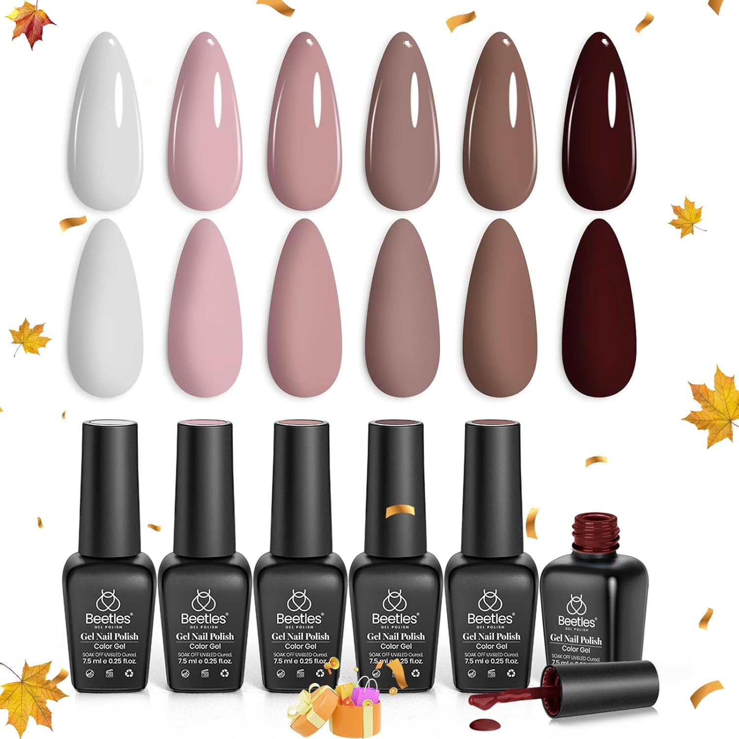 Beetles Fall Gel Nail Polish Set Brown Beige Mauve Pink Nude White Neutral 6 Colors Gel Polish Kit for Nail Art Manicure Soak Off Uv LED Nail Lamp Needed Gifts for Women Coffee Time