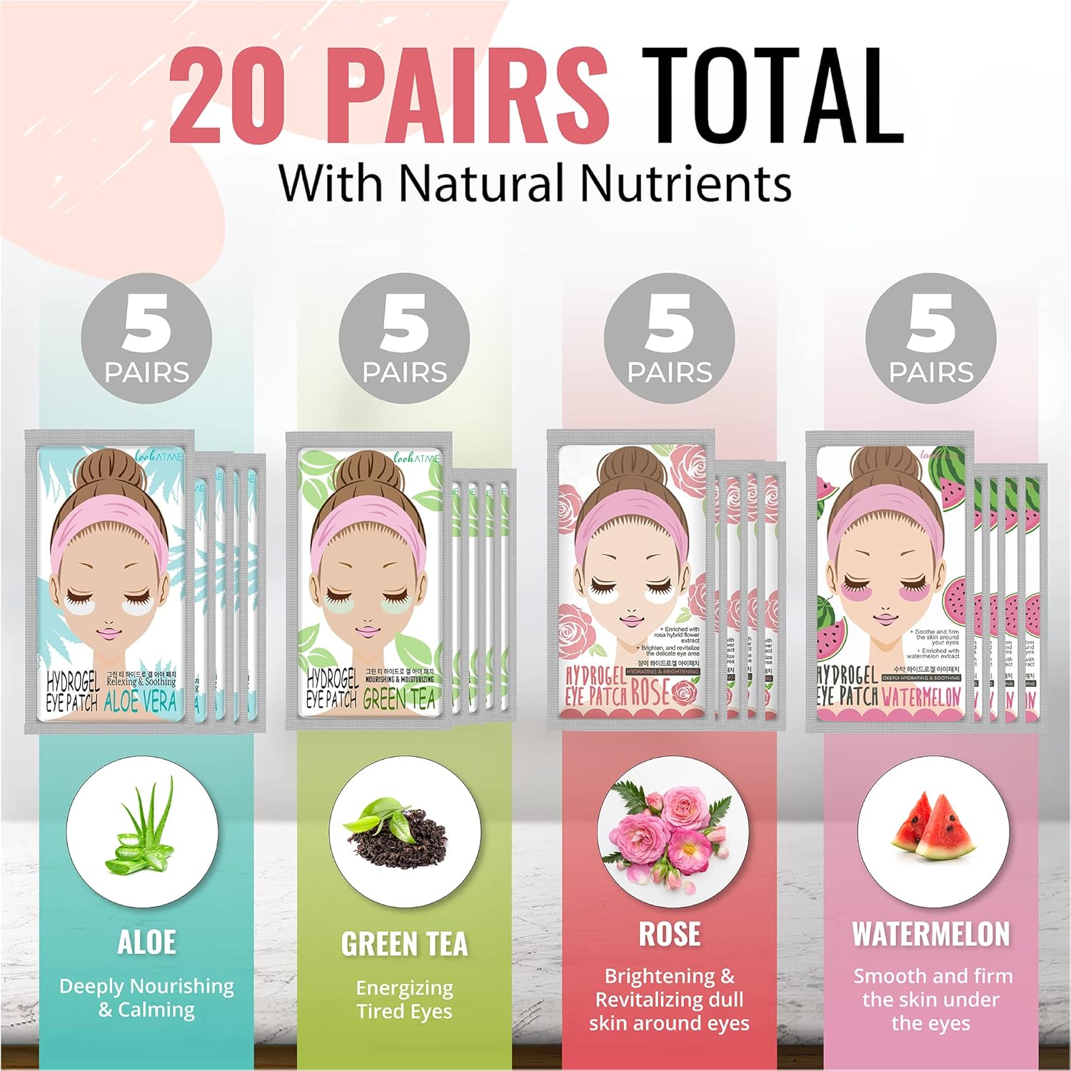 - π πππ ππ‘ ππ’π₯ππ: 20 PAIRS COMBO - Green Tea, Aloe Vera, Rose , Watermelon eye patches for dark circles and puffiness (5 PAIRS EACH), these Korean under eye patches for wrinkles are followed by the high standard KFDA compliance to ensure safety and effectiveness, so you can enjoy a Better Me Time!