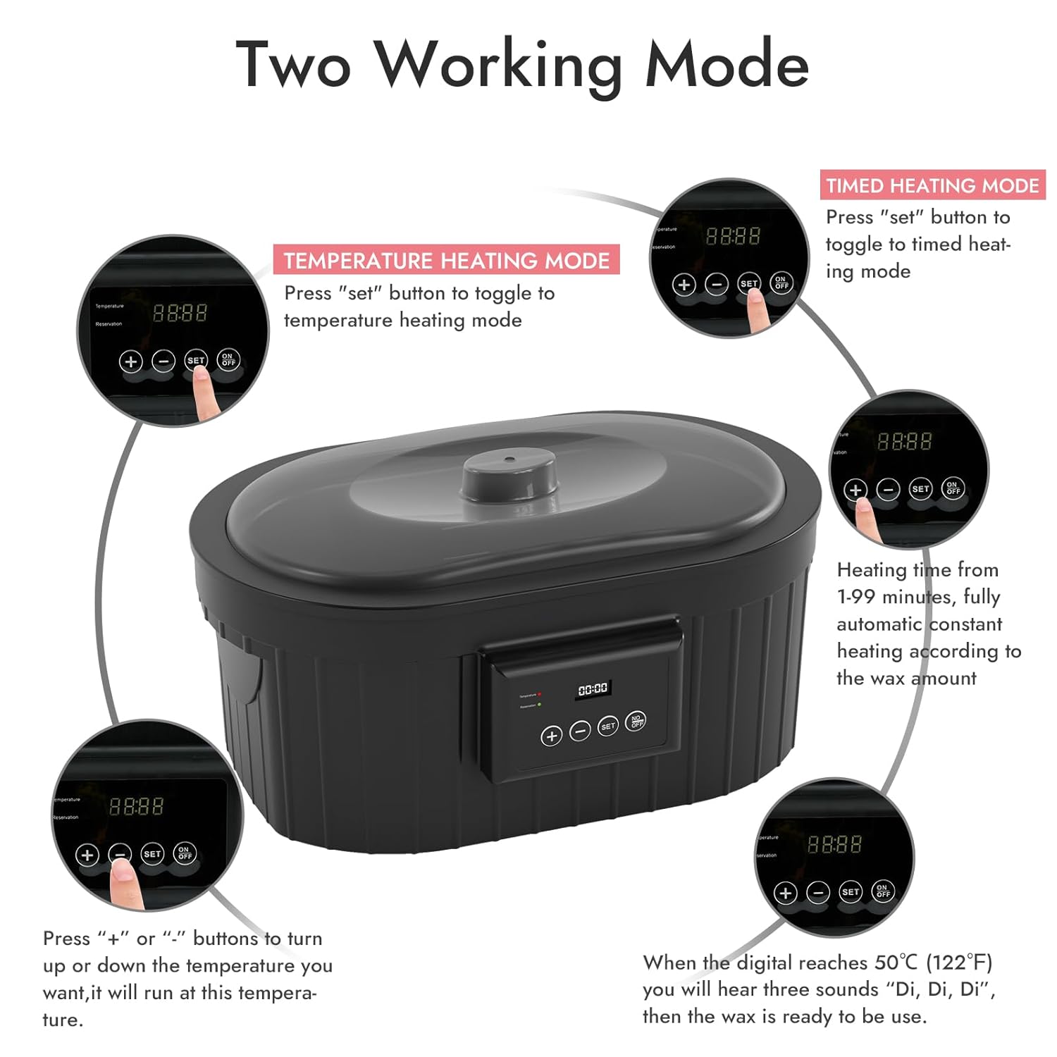 - Easy To Use:Put the paraffin wax into the machine, and then choose the right temperature; Wait a while for the wax to melt the water, dip your hands, elbows or heels into the wax, then relax and enjoy the hot wax spa treatment, peeling off the silky skin. Test: It takes about 50 minutes to completely melt 2 lbs wax at 185°F.