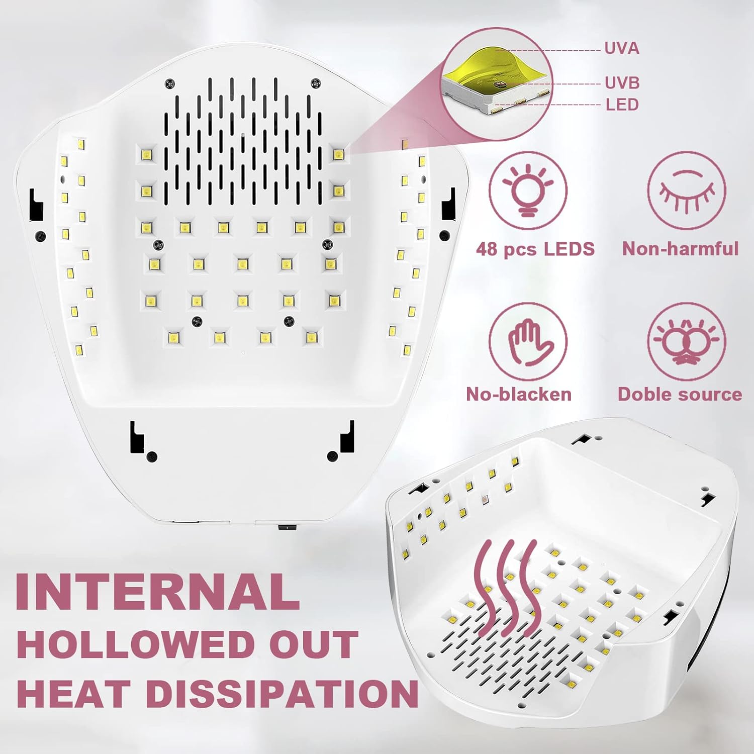 - 96W High Power & Saftey.Powerful 96W nail dryer with 48 Pcs durable and harmless beads shorten your curing time by 50% than normal nail lamp.It is compatible with all gels, non-harmful substances to the human body