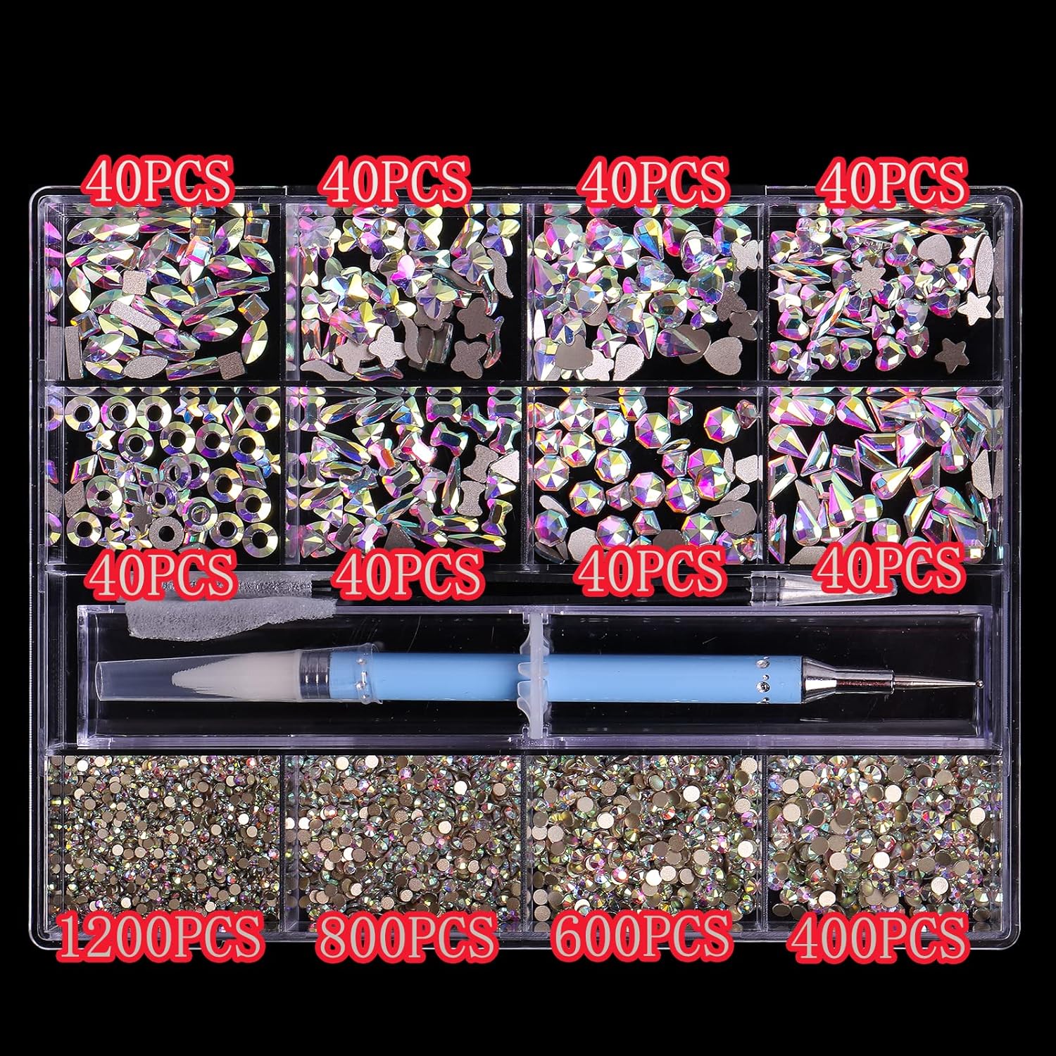 3320Pcs AB Nail Art Rhinestones Crystal,HOINCO 3D Rhinestones Gems Jewels Diamond,24 Types of 320 Diamonds + 3000 Round Beads, Crystals 3D Flat Back Gemstones for Nail DIY Crafts with Tweezers Pen