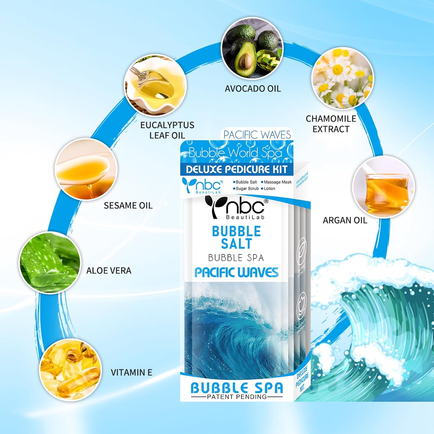 Pedicure Kit Foot Soak Set: Bubble Salt, Sugar Scrub, Massage Mask, Massage Lotion in a Box, 4 Step Foot Spa Kit for Dry Feet, Softens Calluses(1 Set Pacific Waves)