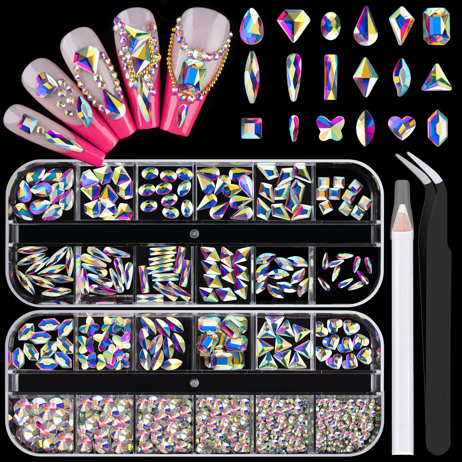- WHAT YOU WILL RECEIVE -- The package includes 1 box of 12 styles of multi-shaped Iridescent AB gems, 1 box of mixed round and 6-style multi-shaped Iridescent AB stones, 1 pickup pencil and 1 tweezer.