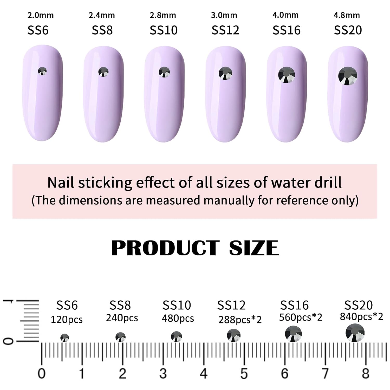 - đź’ŽProduct Packaging: Box Packaging SS6 2MM - 1680 Pcs, SS8 2.4MM - 1120 Pcs, SS10 2.8MM - 600 Pcs, SS12 3MM - 480 Pcs, SS16 4MM - 240 Pcs, SS20 4.8MM - 120 Pcs, 1 pcs Tweezers and 1 pcs Picking Pen.