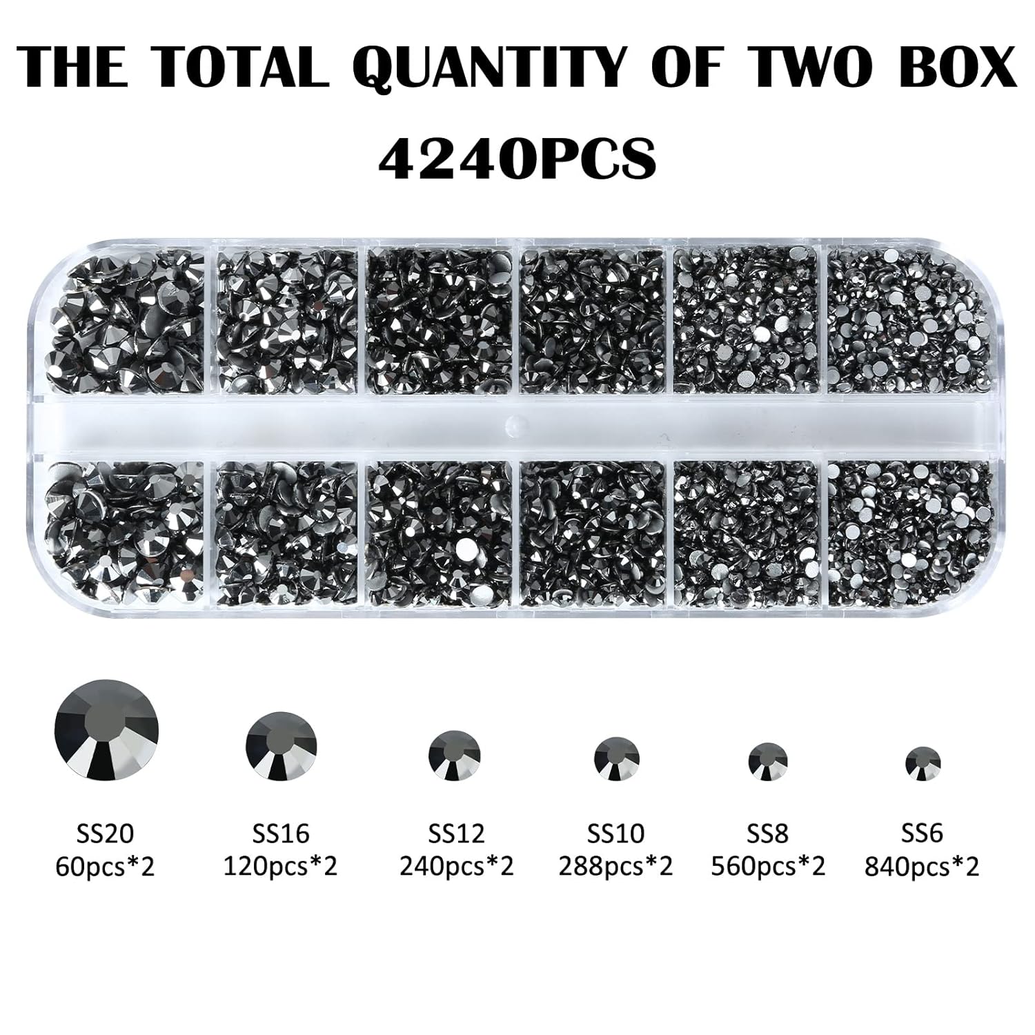 4240Pcs Jet Hematite Flatback Rhinestones 6 Sizes Crystal Diamonds for Nail Art Crafts Clothes Shoes with Tweezers and Picking Pen