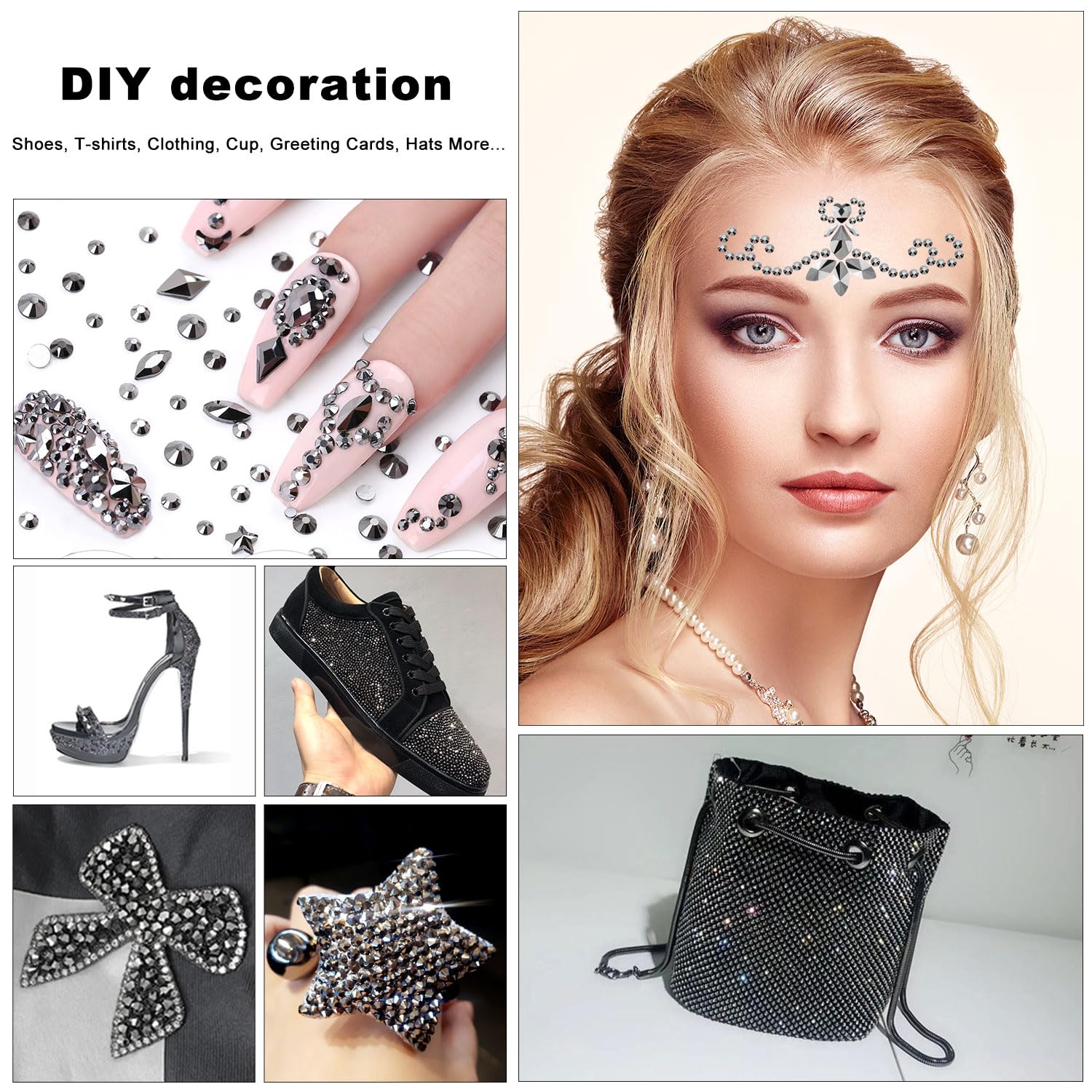 - đź’ŽYou can use rhinestones for, Nails, Art, Jewels, Skin, teeth, face, eye, Makeup, tumbler, glass, crafts, cardstock, phone, phone case, plastic, glasses etc. If you are using shoes, clothing, fabric textile type, I suggest you search on Amazon: B09ZQKTW4V
