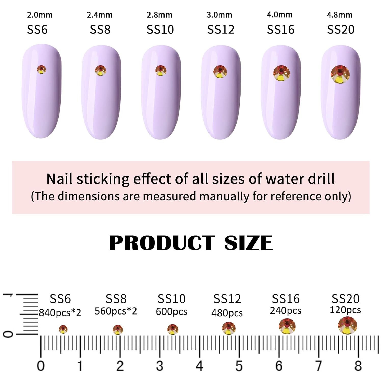 - đź’ŽProduct Packaging: Boxed SS6 2MM - 1680 Pcs, SS8 2.4MM - 1120 Pcs, SS10 2.8MM - 600 Pcs, SS12 3MM - 480 Pcs, SS16 4MM - 240 Pcs, SS20 4.8MM - 120 Pcs, 1 pcs Tweezers and 1 pcs picking pen.