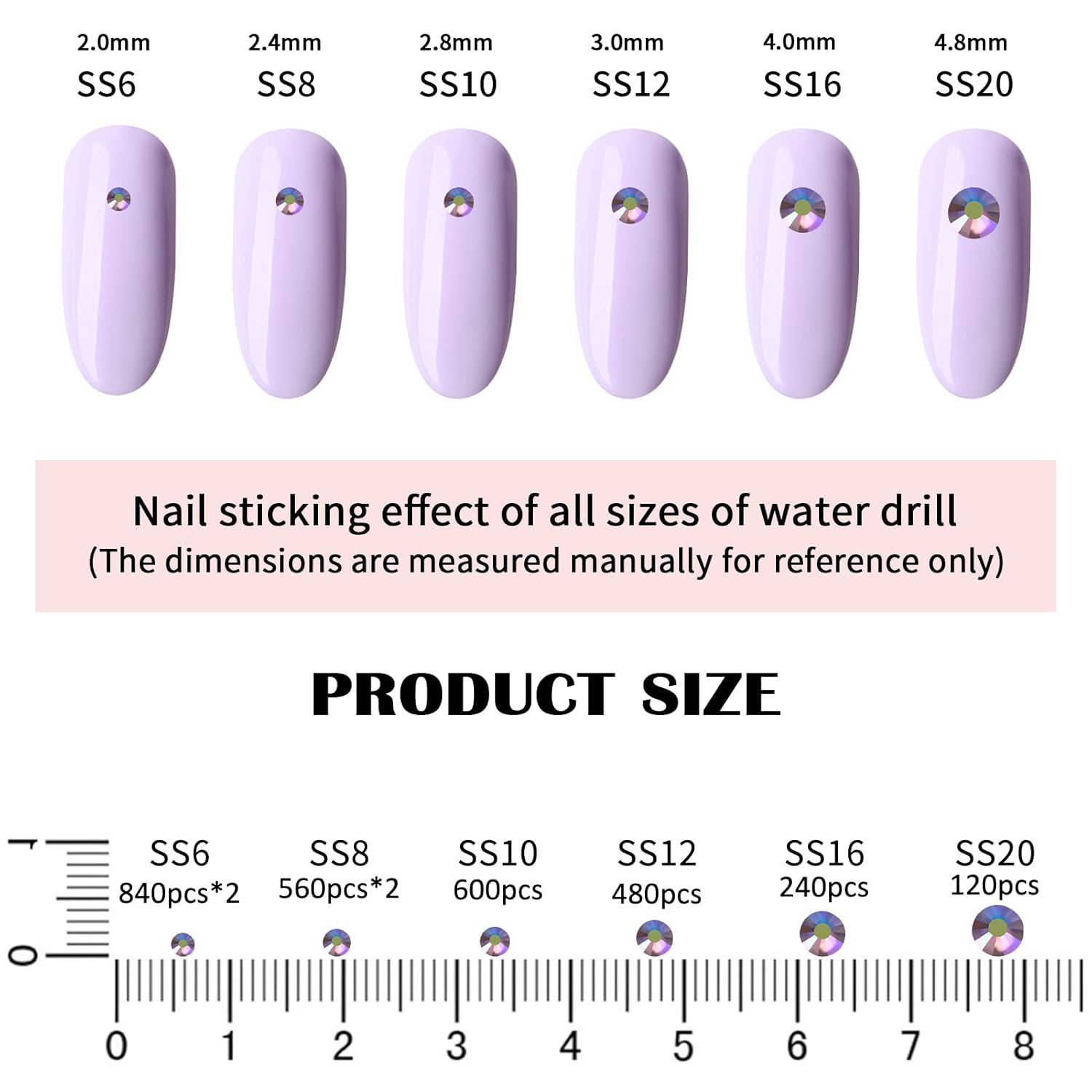 - đź’ŽProduct Packaging: Boxed SS6 2MM - 1680 Pcs, SS8 2.4MM - 1120 Pcs, SS10 2.8MM - 600 Pcs, SS12 3MM - 480 Pcs, SS16 4MM - 240 Pcs, SS20 4.8MM - 120 Pcs, 1 pcs Tweezers and 1 pcs picking pen.