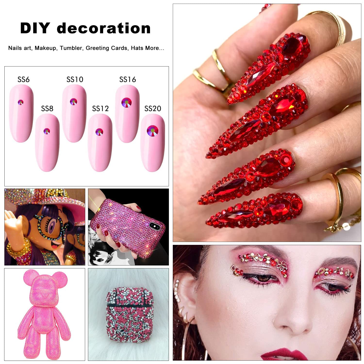 - đź’ŽUses: You can use rhinestones for nails, art, jewelry, skin, teeth, face, eyes, makeup, glasses, crafts, cardstock, cell phones, phone cases, plastic, glasses, etc.