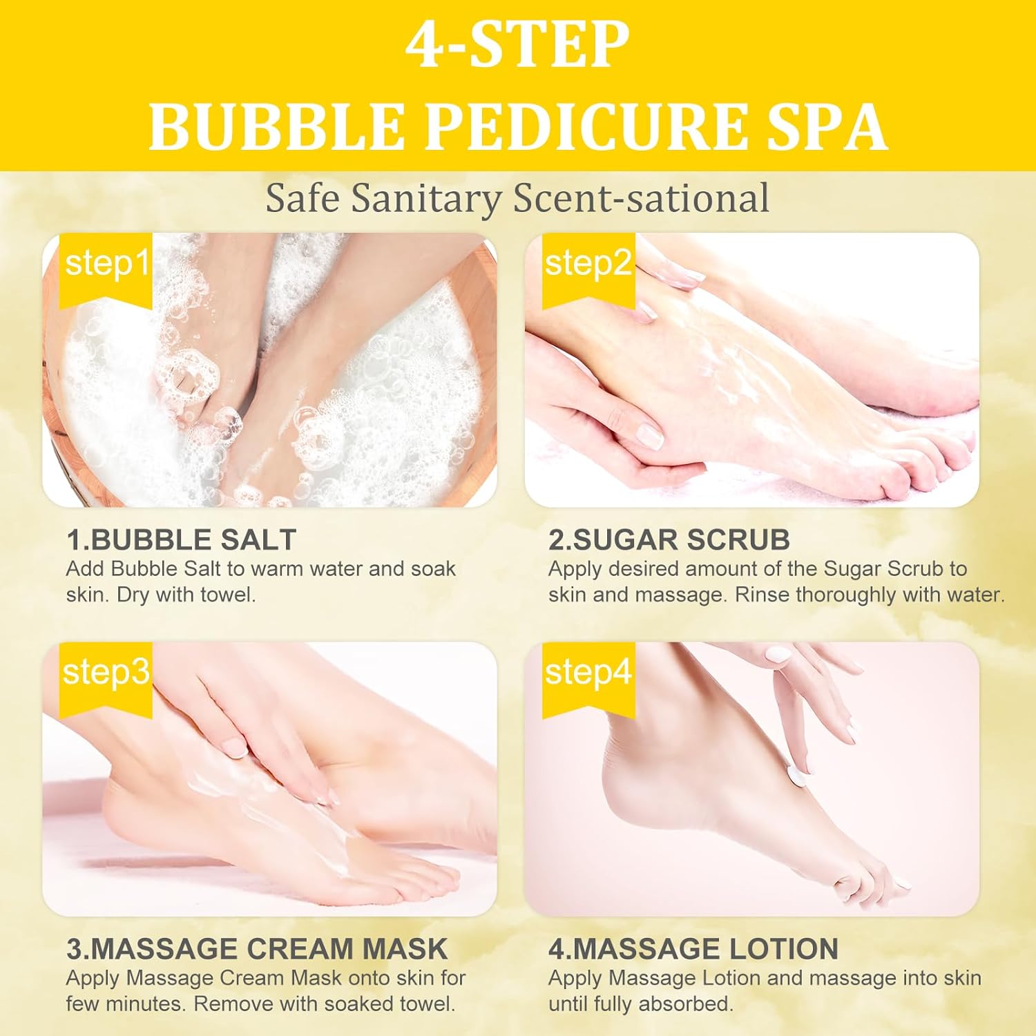 - β[Package Includes]: Exfoliating Foot Spa Pedicure Kit consists of 3* Bubble Salt, 3*Sugar Scrub, 3*Massage Mask, and 3*Massage Lotion for a 4-step foot spa at home. Formated to be gentle on the skin, you are sure to feel your skin feeling soft and supple after use.