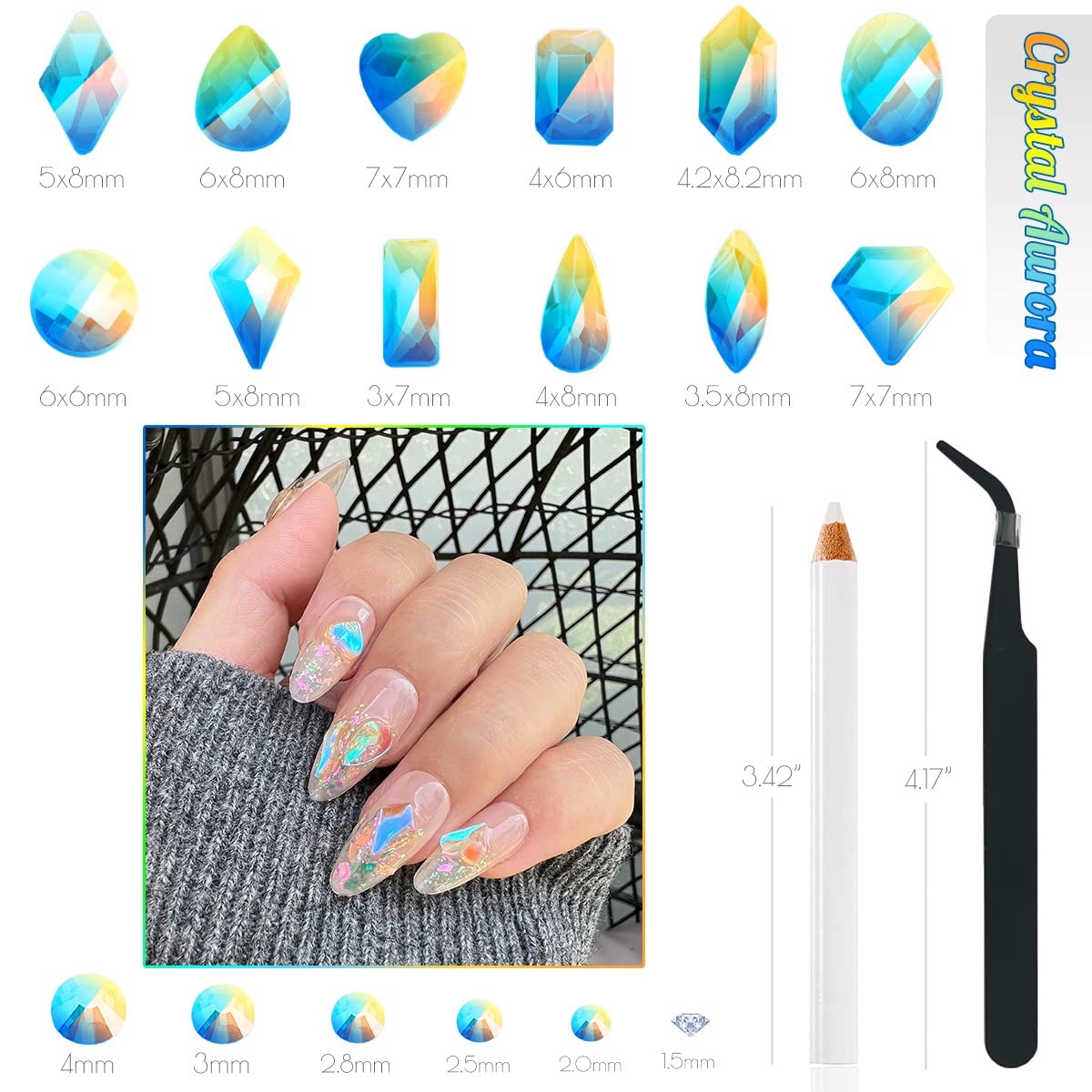- ❤【2 Boxes 24 Grids K9 Glass High Quality Aurora Nail Rhinestones + Stainless Steel Tweezer + Pickup Pen】qiipii sparkling Aurora rhinestones nail crystals. Including 120pcs multi-shaped clear moonlight rhinestones, multi-sized round aurora crystals gem rhinestones. Enough amounts and more shape options for your daily work, go out or other decoration purposes. Comes with 1 Stainless Steel Tweezer and Pickup Pen for Manicure DIY Decoration at Home Salon Supplies.