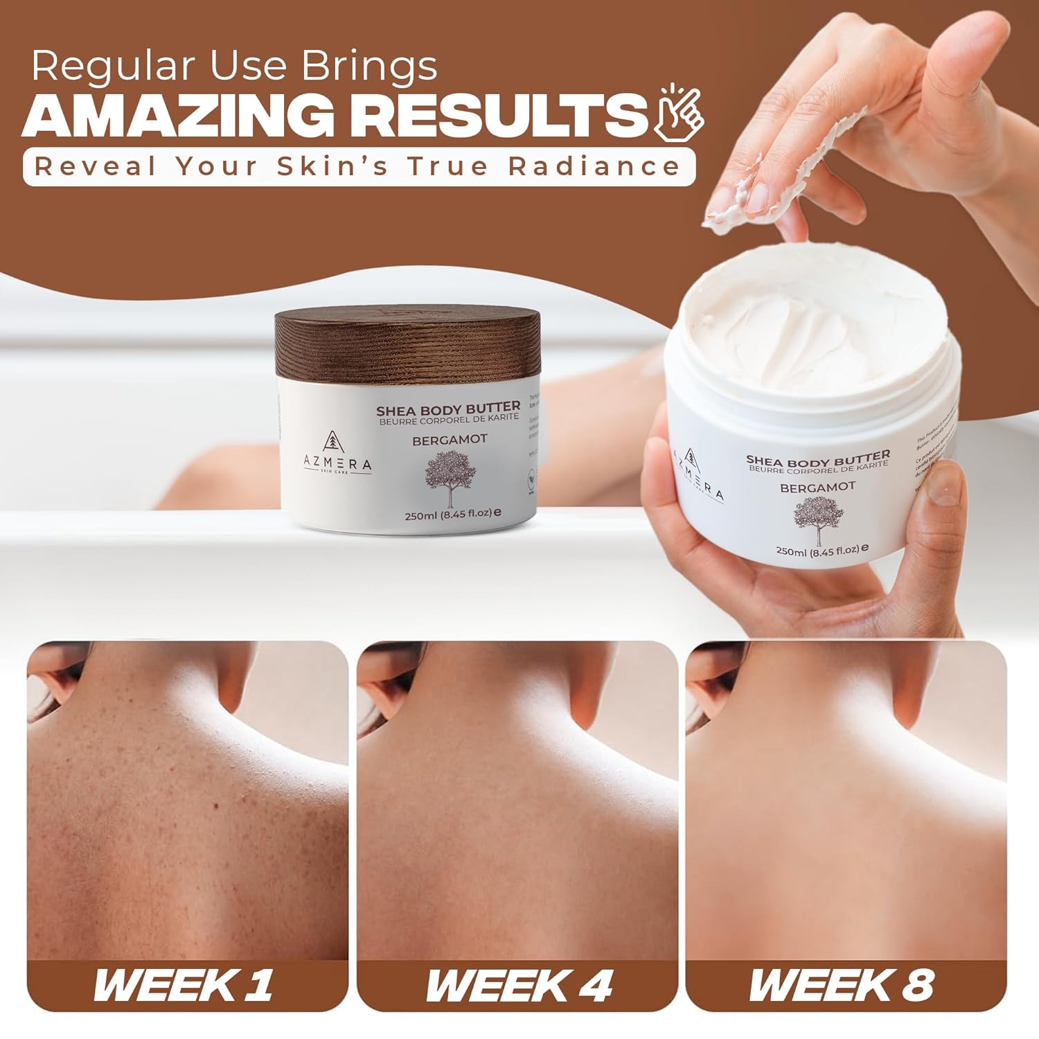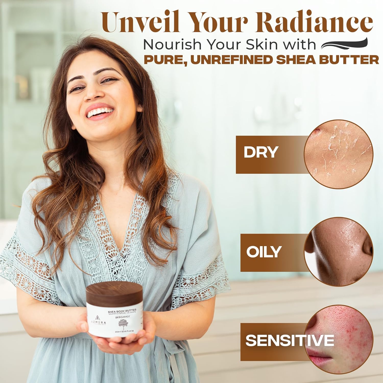 AZMERA Handcrafted Whipped Shea Body Butter – Luxurious Moisturizer for Dry, Sensitive Skin with Bergamot, Argan Oil & Vitamin E – Vegan, Non-Greasy Skincare – 8.82 oz