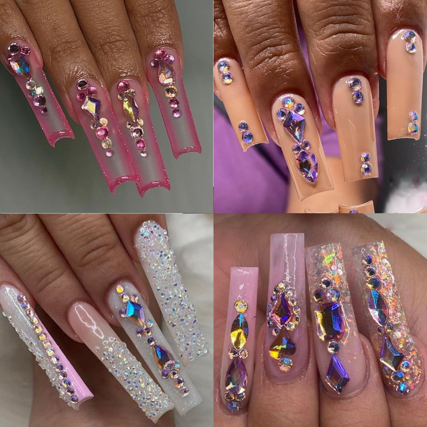 HNUIX Nail Rhinestones - 1600pcs 3D Multi Shape Size Crystal, Pink AB Nail Gems, Flat Back, with Kit, for Nail Art, DIY Decorations