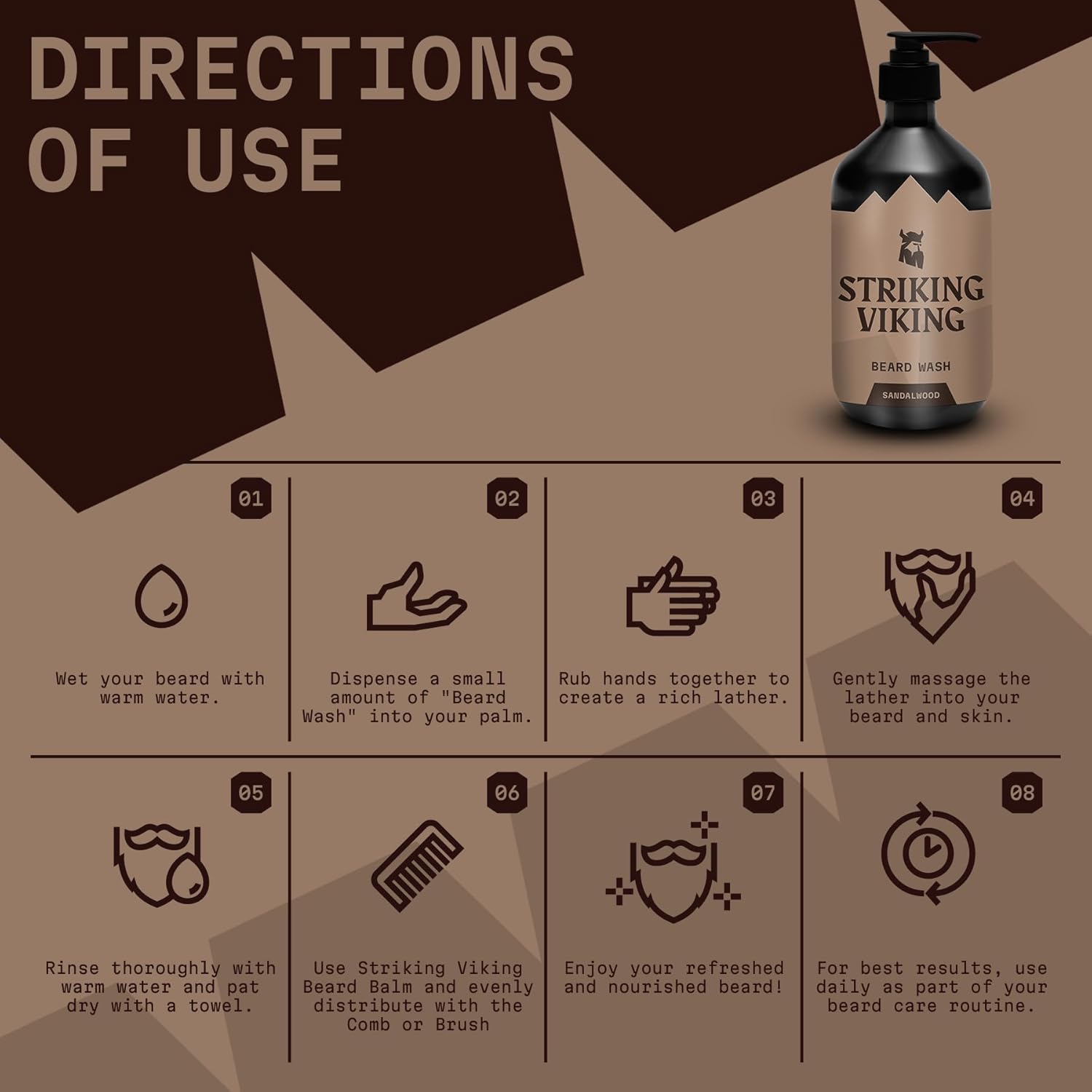 - Easy Grooming Routine: Wet your beard with warm water, apply a small amount of beard wash, and massage it in. Rinse thoroughly and gently pat dry. Follow up with our Striking Viking beard balm for an ideal finish