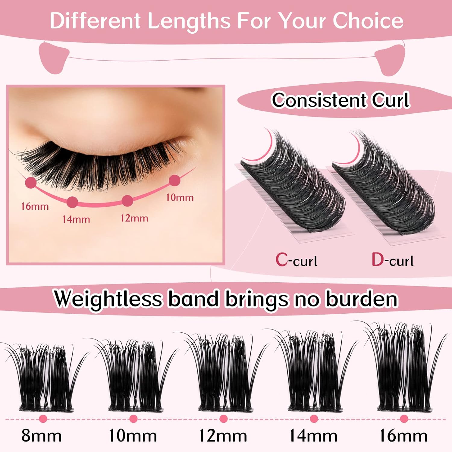 • Comforatable & Reusable: Our brand eyelash clusters have super thin band and they are very lightweight. Comfortable to wear the whole day and whole night. Individual cluster lashes can be reused up to 5 times if they are nice cared.