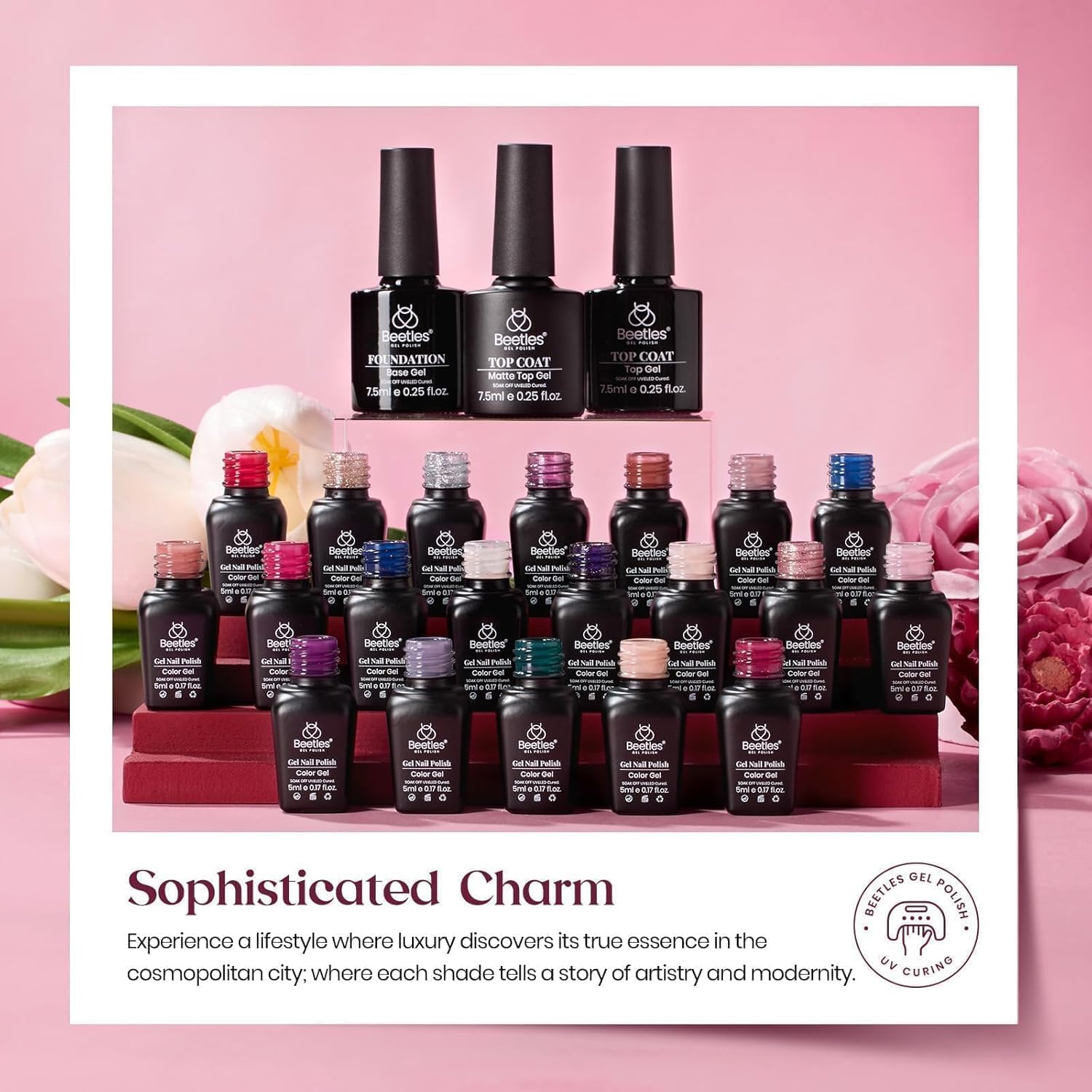 - Make a Bold Statement:DIY Home Mani Gel Nail Polish Kit with 20 brown red glitter colors as well as base coat matte glossy gel top all in one box! This Beetles gel nail polish set includes every must-have color! An array of every shade you'll need such as white, nude, red, green, glitter gel nail polish colors. Our color range will match any outfit you style your nails with in winter
