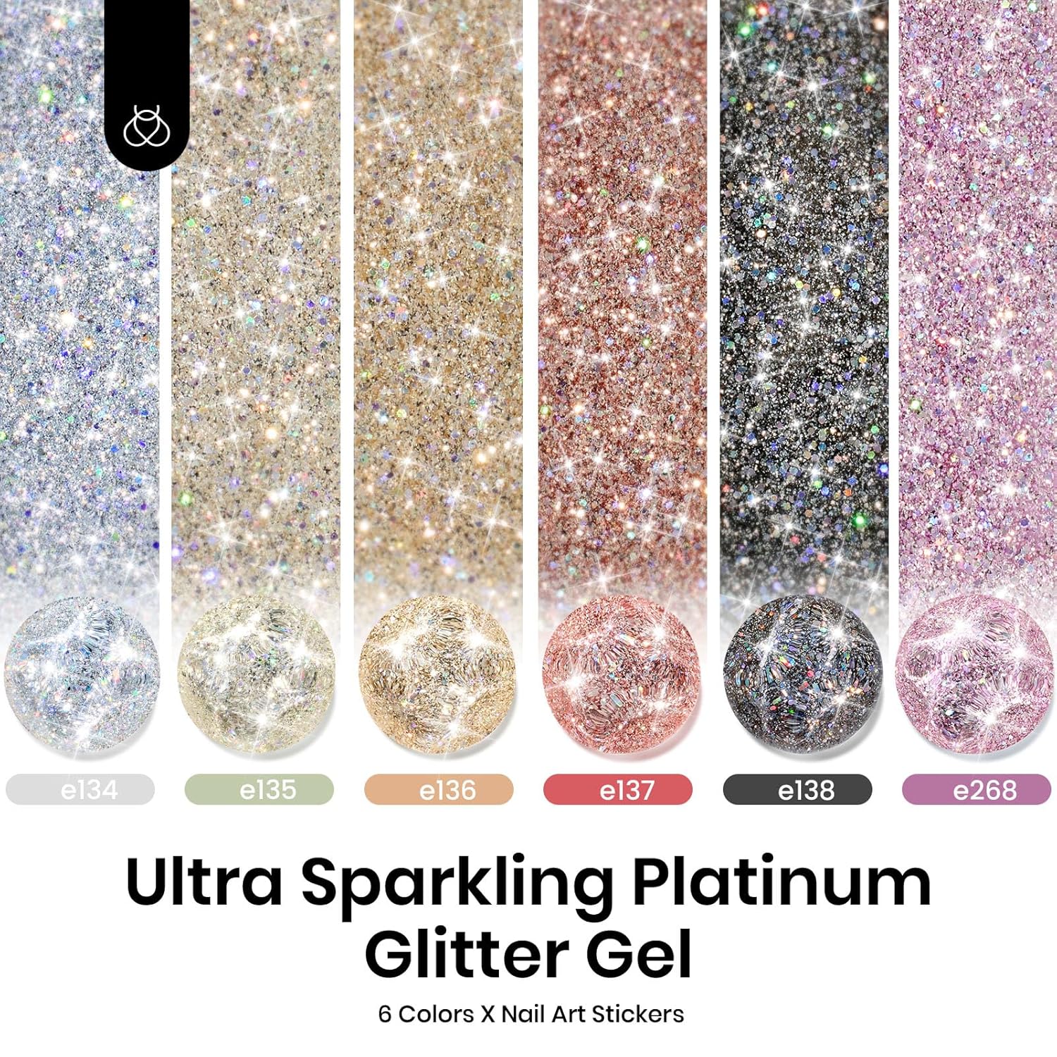 - 6 Diamond Shine Gel Polish: Beetles glitter gel nail polish, sparkly nails shining differently under different lights. Also come with nail art stickers to give you more inspiration. Color Number: e134-e138-e137-e136-e135-e268