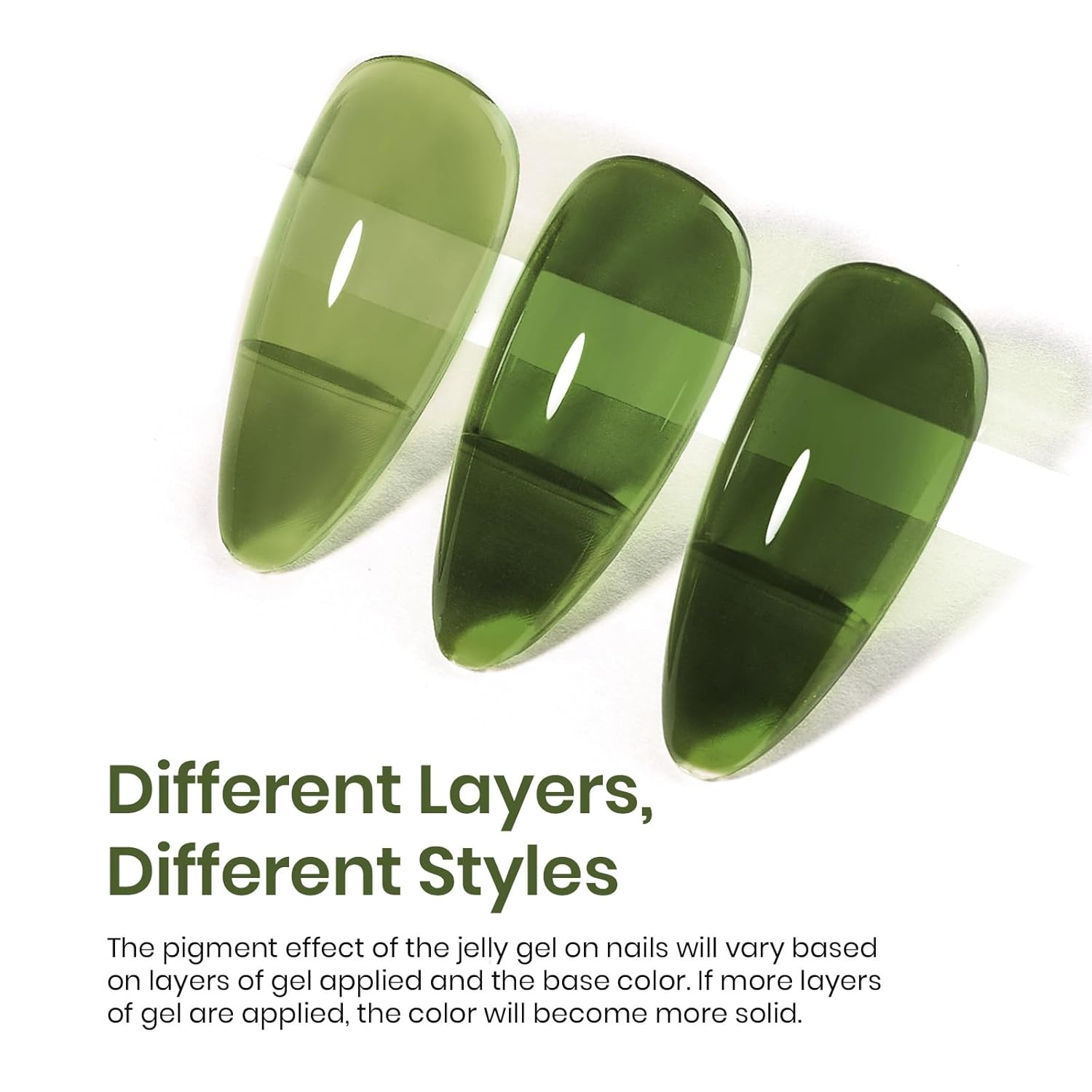 - Beetles Gel Polish: Sheer Green gel polish is essential for all season! (color number: e826) 1 Pcs 15ml/0.5oz jelly gel nail polish, each layers gives you different green styles. You'll be dizzy with delight wearing this sheer color gel.