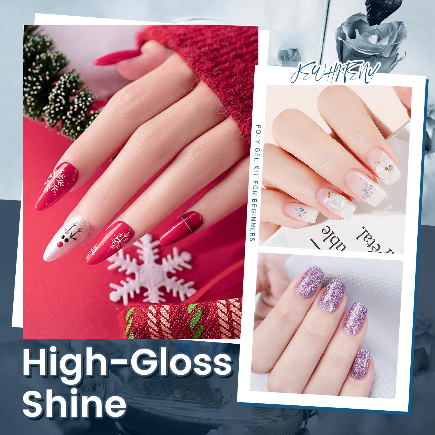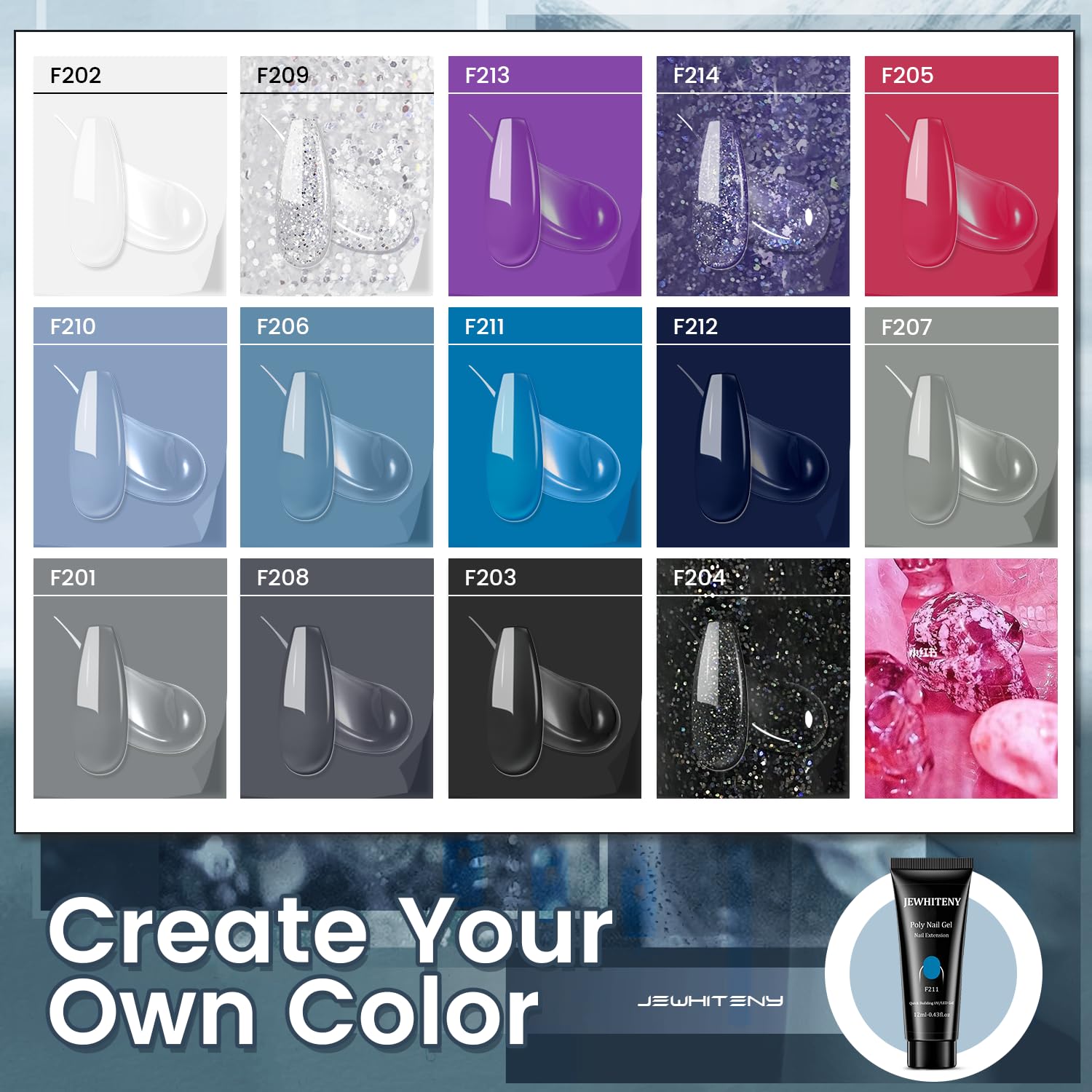 - [HEALTHY,NATURAL,FLEXIBLE]:JEWHITENY poly gel made with non-toxic ingredients keeping your nails healthy with a low odor formula!superior to other nail extension products, and fits your nails seamlessly。The new upgraded formula makes your lengthened nails as flexible, strong and lightweight as natural growing nails.Double the beauty, but without the extra burden.