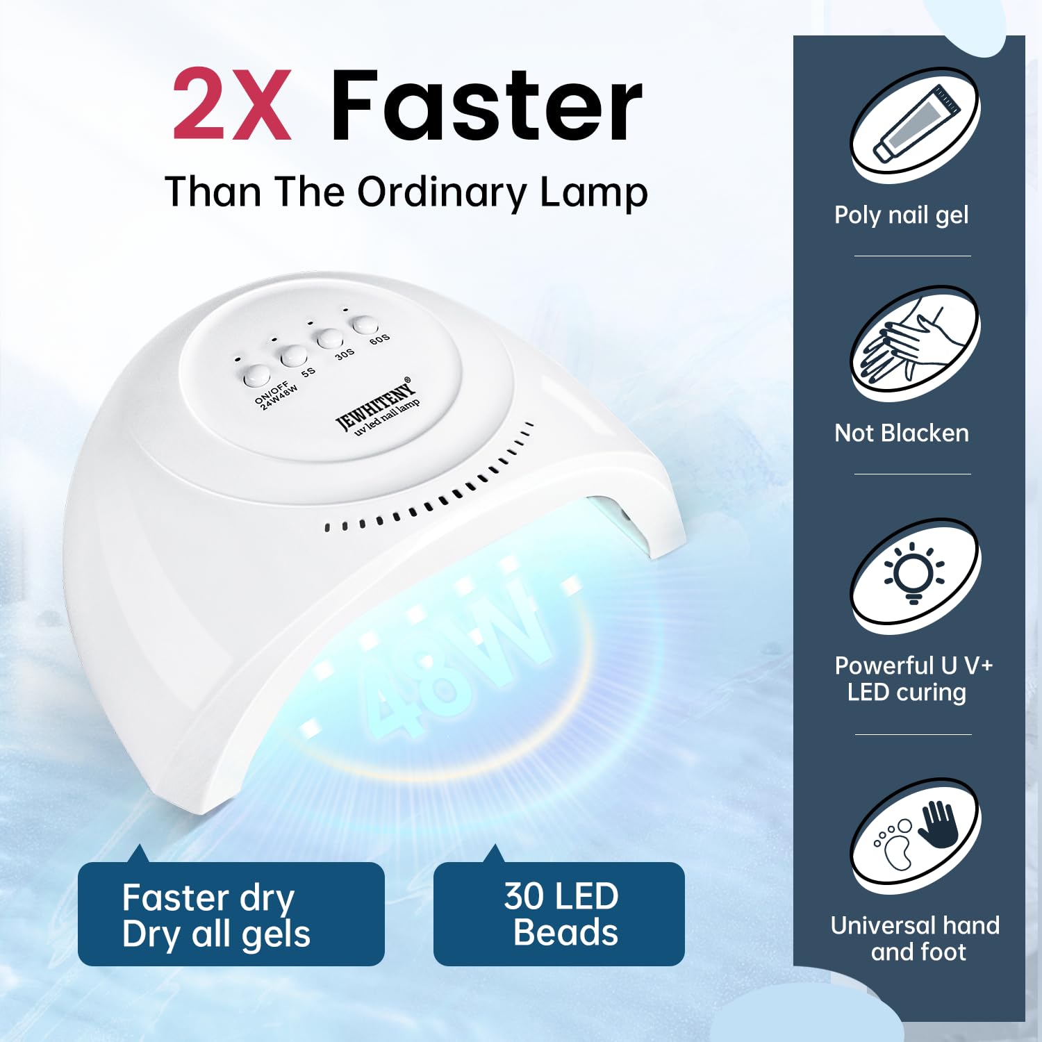 - [PREMIUM 48W UV LED NAIL LAMP] -High-quality LED beads with 50,000+ hours lifespan test, longer service life last up to 5 years. The nail extension poly gel nail kit can be cured fastly with this premium nail dryer. The Nail lamp suitable for all kinds of polygel, gel nail polish, nail prep dehydrator, nail primer, base coat and top coat ect. Average drying time is shortened by more than 50% with this Powerful nails light.