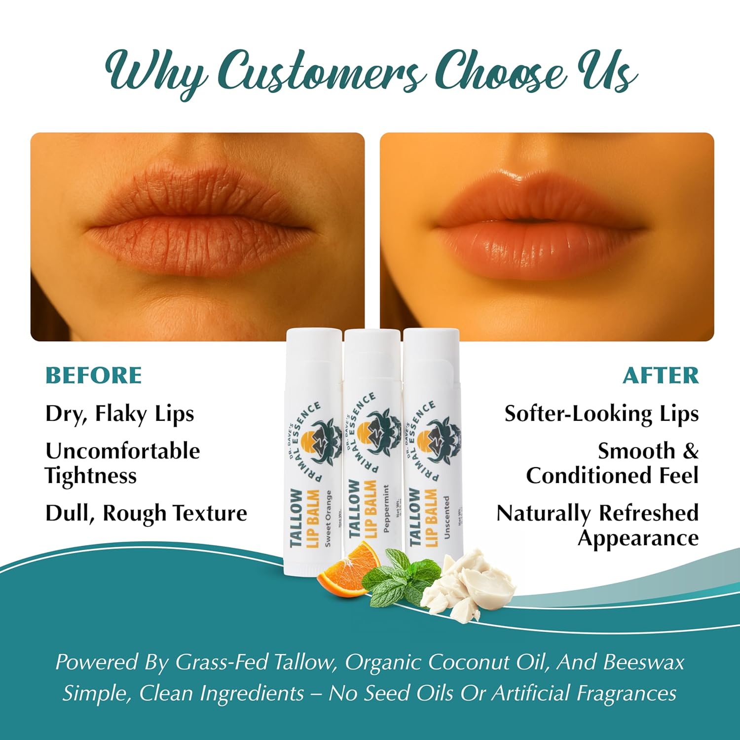 - All Natural Formula: Made without seed oils or artificial fragrances, our tallow lip balms provide simple, effective care with a thoughtfully selected blend
