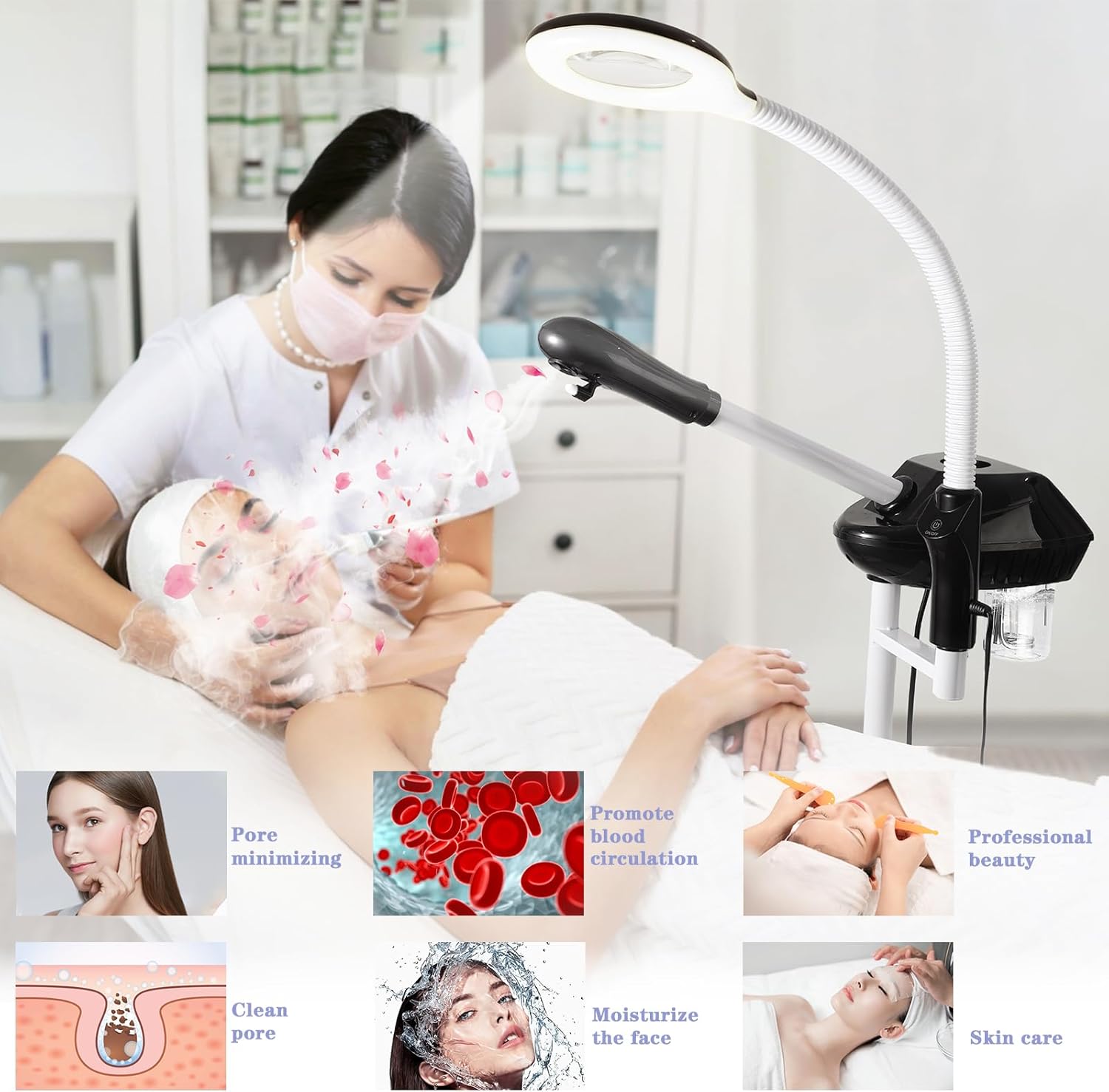 Professional Facial Steamer, 2 in 1 Face Steamer on Wheels, with 5X Magnifying Lamp, Facial Steamer with Time Setting, Stand Face Steamer Adjustable Height for Spa, Salon and at Home use