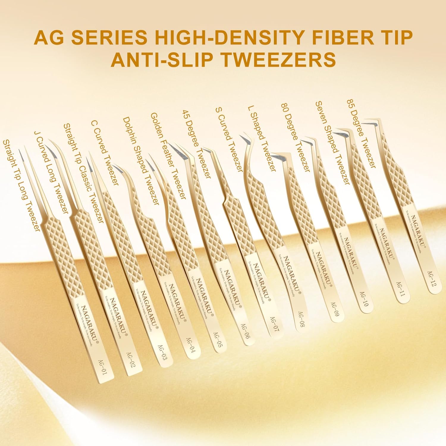 NAGARAKU 1 Pair Precision Fiber Tip Tweezer for Eyelash Extensions Professional Eyelash Tweezers Antistatic Straight & Curved Tip Tweezers with Box(Isolation & Volume Lash Tweezers AG-01 & AG-02)