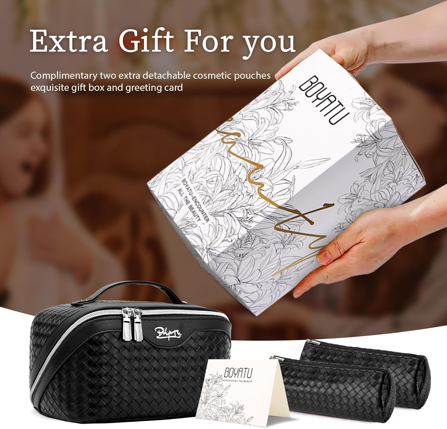 - Exquisite Packaging: This travel make up bags for women comes beautifully packaged in an exquisite gift box, with a thoughtfully designed greeting card. It will be a great gift for ladies on Valentine's Day, Mother's Day, Birthdays, Christmas,Thanksgiving Day, Anniversary Day and more.