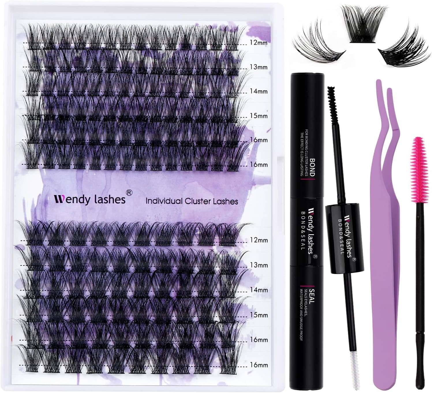 - Lash Clusters Kit: Including lash clusters, lash bond and seal, tweezers for cluster lashes, and eyelash clusters brush, provide all the tools you need to make your eyelash extension in just ten minutes.