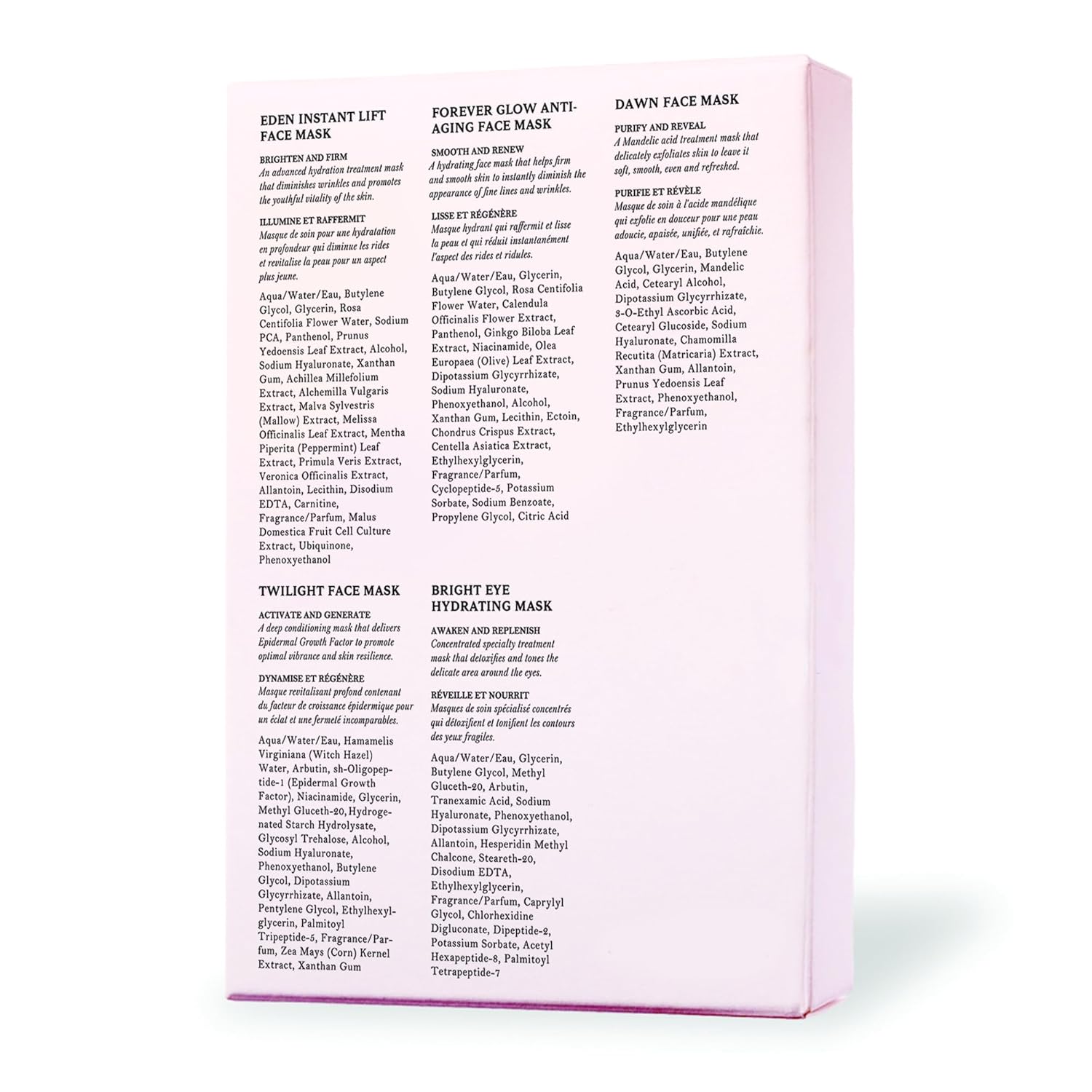 - CURATED FOR EVERY SKIN NEED – This set features Eden Instant Lift Face Mask, Forever Glow Face Mask, Dawn Face Mask, Twilight Face Mask, and Bright Eye Hydrating Mask to address daily skin concerns.