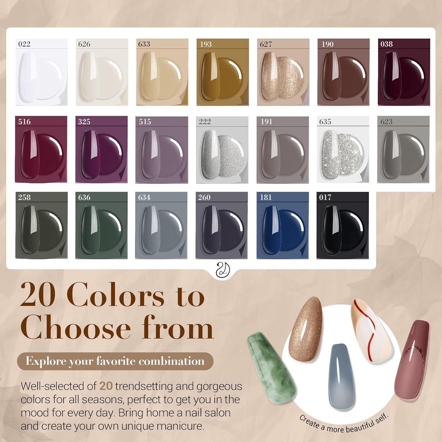 - What You Get: 20*Vintage Autumn Winter Collection dip powder colors (0.34 oz. each), 4*dip nail liquid set (with base coat/top coat/activator/brush saver, 0.34 oz. each), 7*additional professional dip manicure kit tool with 1*nail brush/1*cuticle pusher/nail file/2*dip powder gel brush replacement, 1*nail polishing block(Random color), 1*dip powder recycling tray, user manual quick start guide