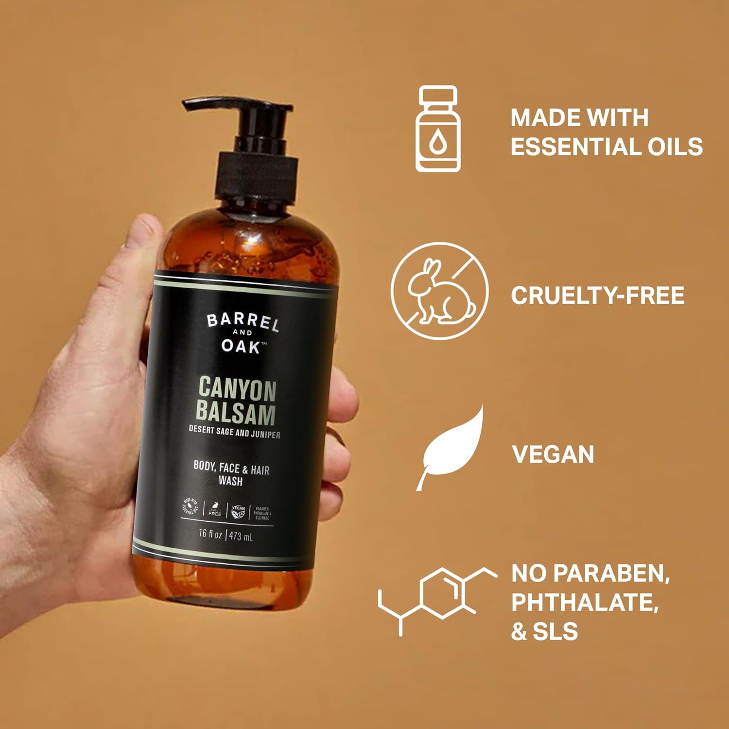 Barrel & Oak All-in-One Wash for Face, Hair, & Body, Vegan & Hydrating Face, Shampoo and Body Wash for Men, Grooming Kit Gifts for Men, Canyon Balsam, 16 oz