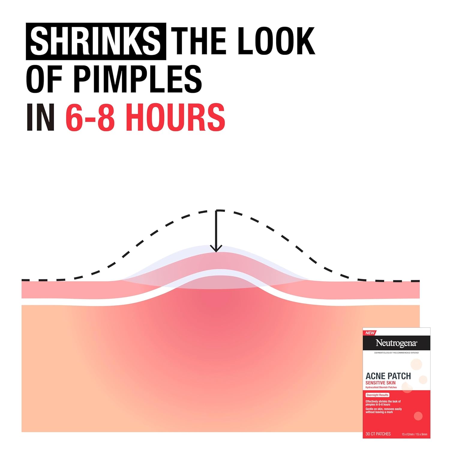 Neutrogena Sensitive Skin Blemish Patches, Acne Patches for Sensitive Skin, Hydrocolloid Treatment Visibly Shrinks Pimples Overnight, 2 Sizes, 30 Count