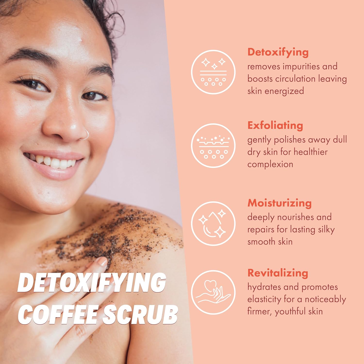 - MOISTURIZING AND RICH IN ANTIOXIDANTS our detoxing coffee exfoliator is made shea butter, sweet almond oil and vitamin e to help restore your natural skin while scrubbing away unwanted toxins and dead skin cells