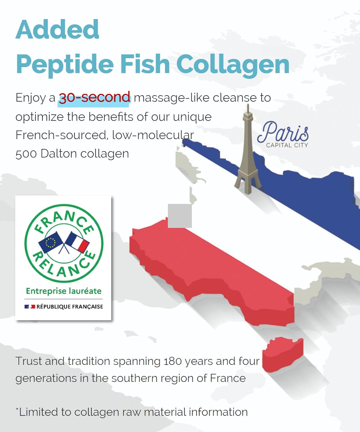 - From French Valleys to Your Vanity: Discover the wonders of low molecular weight collagen, harvested from the untouched valleys and serene pastures of France. With every application, you're indulging in a European beauty secret passed down through generations. Just 30 seconds of massage, and you'll be on your way to rejuvenated, youthful skin that speaks of timeless elegance