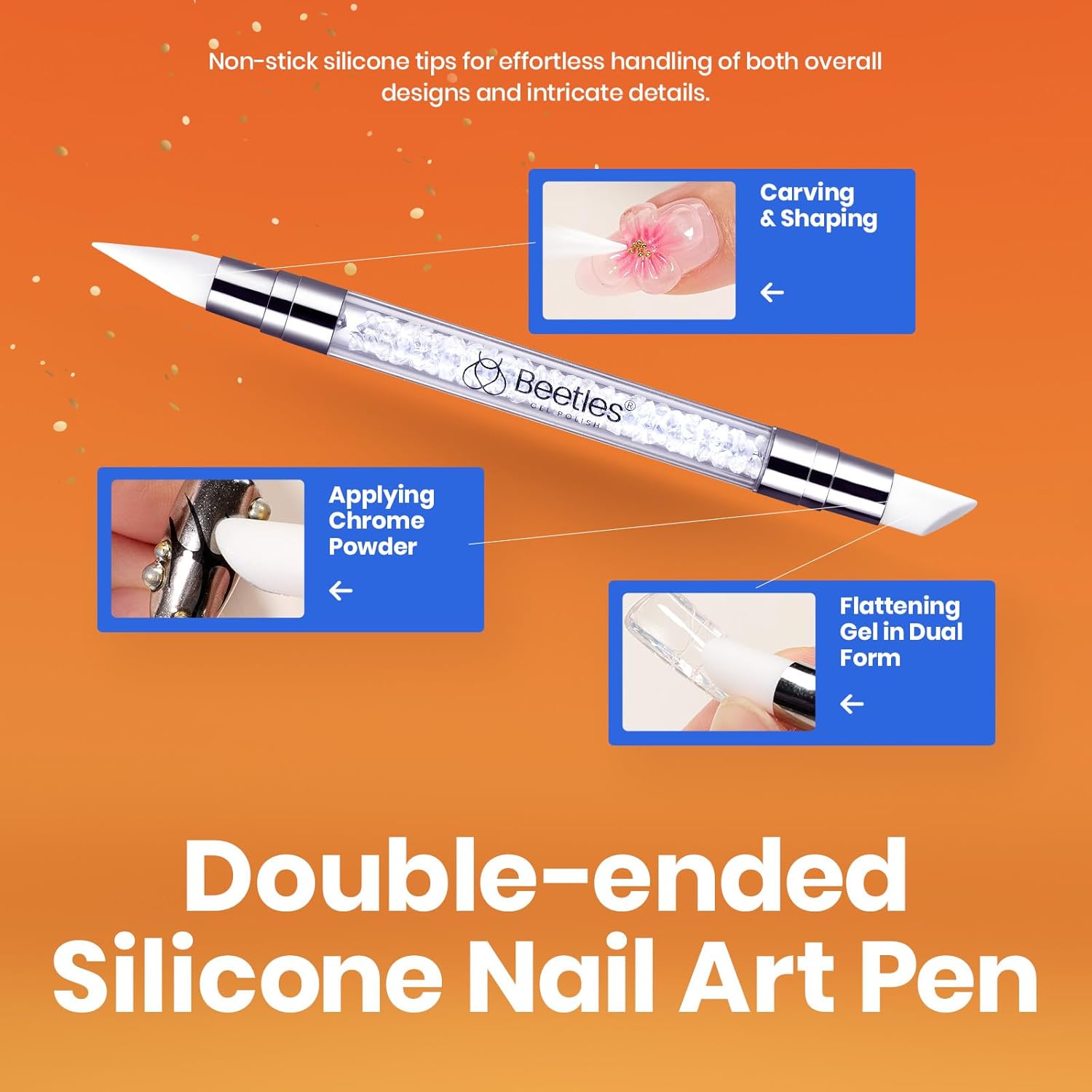 - With Dual-Ended Sculpture Pen: Comes with chrome nail powder and a thoughtfully designed dual-ended silicone pen. The silicone material resists sticking to the gel, while the dual-ended design allows for both broad and intricate detailing, ensuring a flawless finish for your nail art.(Tips:THE SOLID BUILDER GEL MAY BE HARD AT LOW TEMPERATURE,PLEASE PUT IT INTO WARM WATER FOR FEW MINUTES BEFORE USE.AND PLEASE KEEP THE 3D NAIL ART GEL IN A COOL PLACE WHEN THE WEATHER IS HOT. )