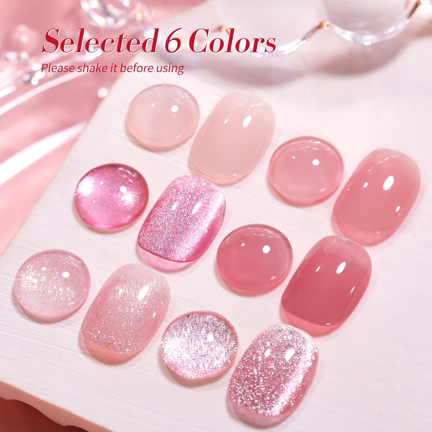 Born Pretty Gel Nail Polish Pink Nude Series,Jelly Transparent,Cat Magnetic Eye,Shimmer Glitter Holographic Pink Nude Gel Polish Kit for Salon Manicure and Nail Art DIY at Home 6Colors
