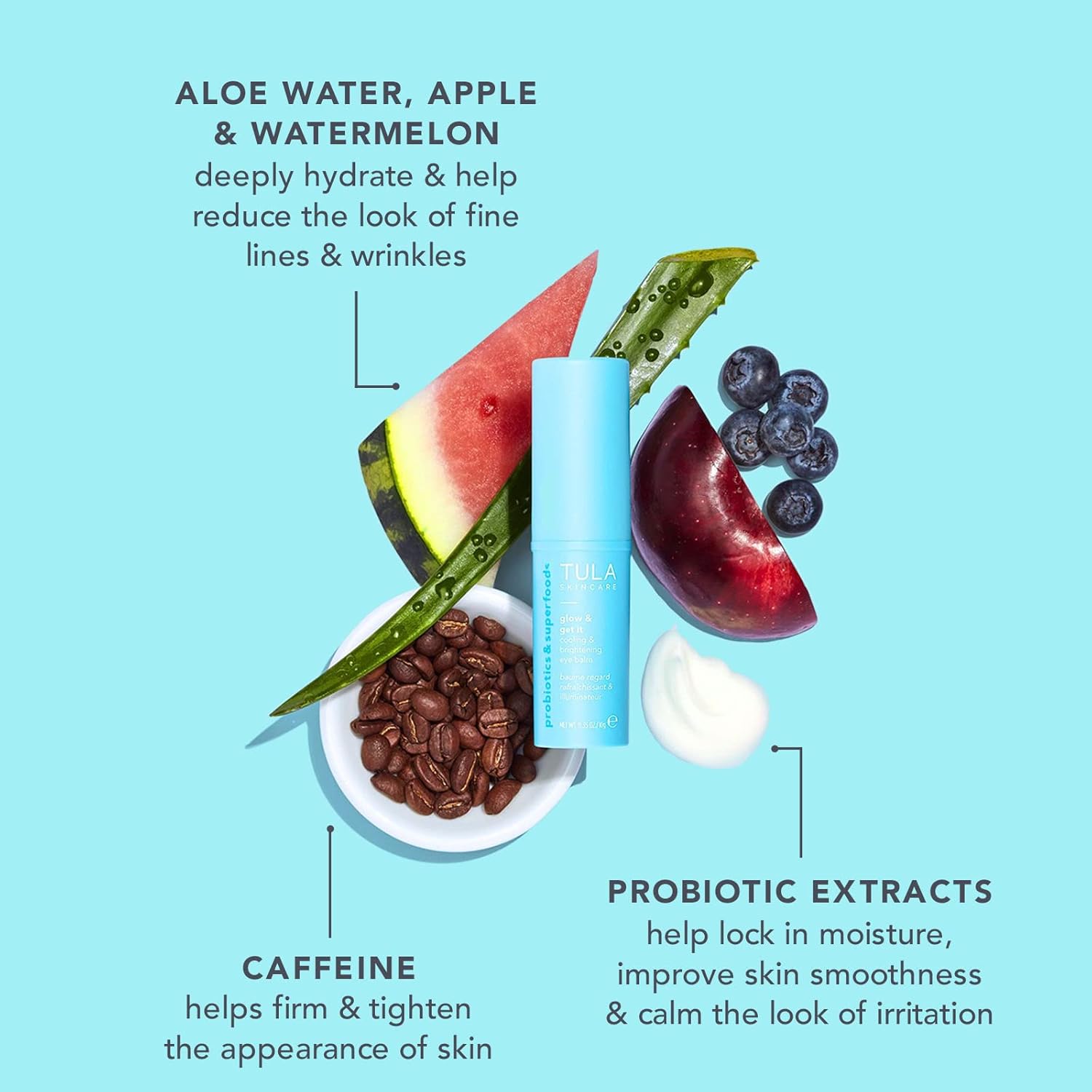 - BRIGHTENING EFFECT: Caffeine, apple & watermelon firm & improve the look of eye puffiness any time of day!
