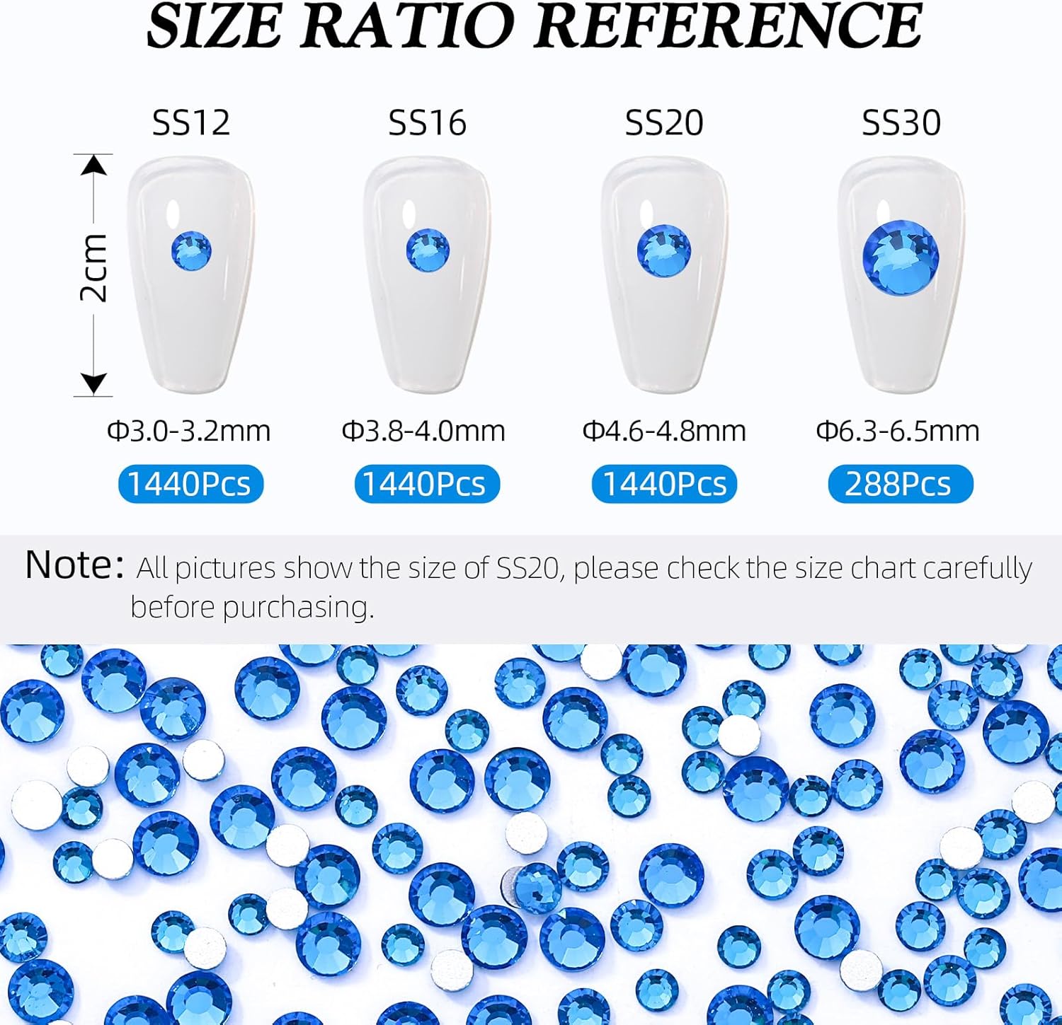 Capri Blue Flatback Rhinestones, Glass Rhinestones for Nail Art and Craft, Glue Fix, Loose Crystal Gemstones(Capri Blue, SS12, 1440pcs, 2.9-3.0mm)
