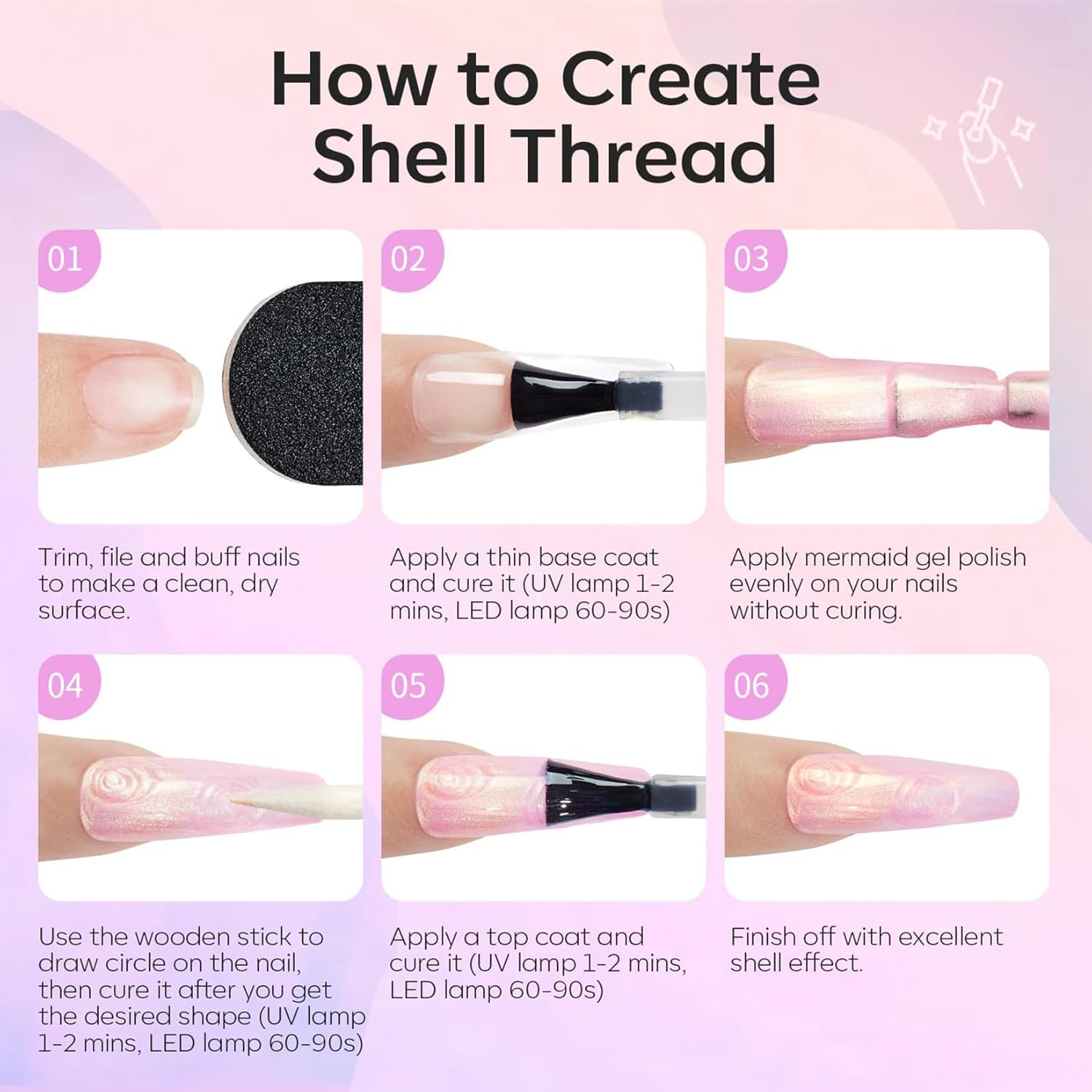 modelones Gel Nail Polish, 6 Colors Shimmer Pearl White Pink Purple Mermaid Nail Drawing Glitter Gel Polish with Dotting Pen Soak Off Led Nail Polish Swirl Shell Thread Effect Manicure DIY Gift