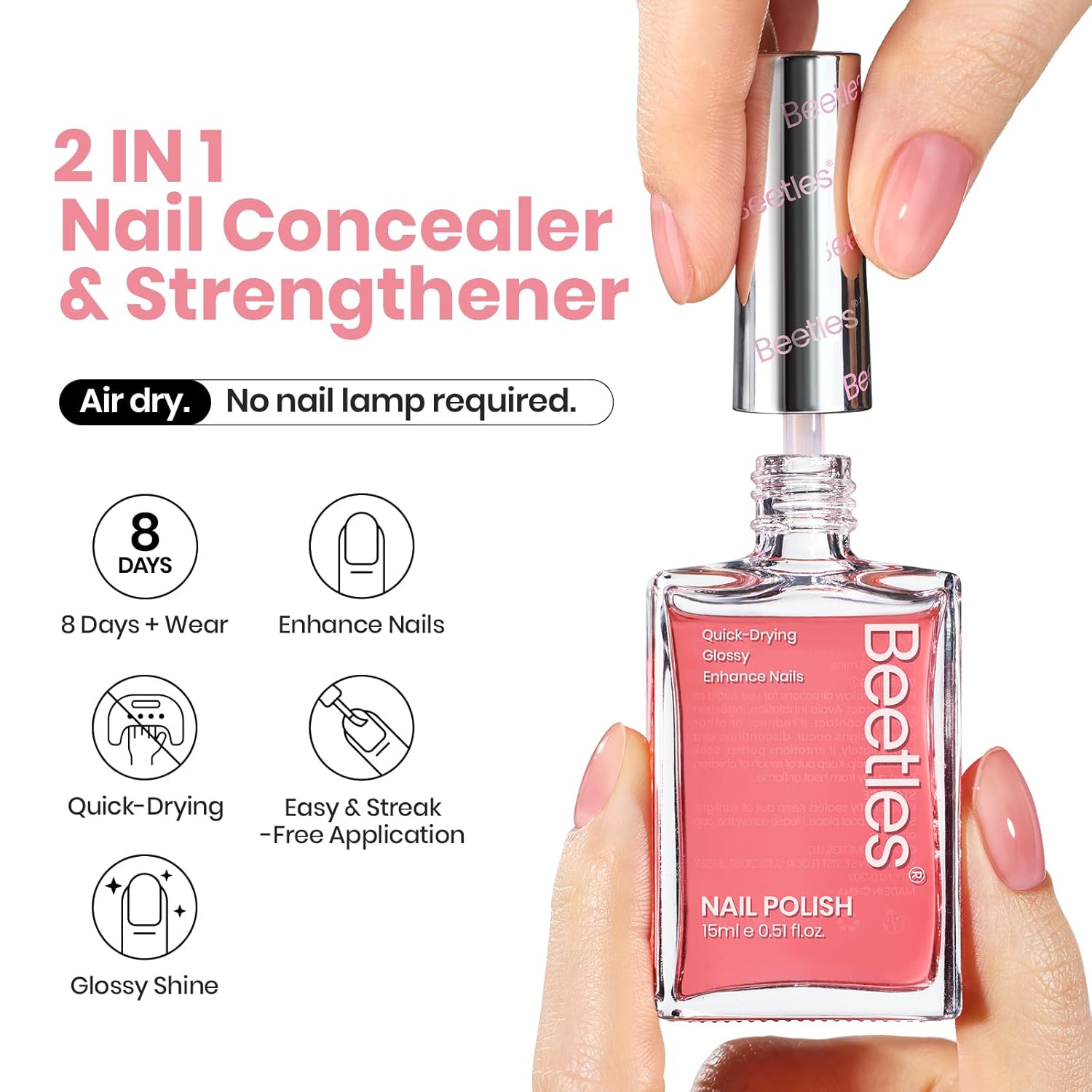 - Upgraded Nail Concealer and Strengthener 2 in 1: This nail base liquid features a transparent pink color that looks like natural nails . After application, the surface of the nails appears plump and shiny, effectively covering problems such as yellowing, damage, cracks and roughness, making the nails look healthier and more elegant. Suitable for slightly or moderately damaged nails.